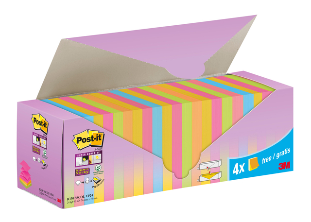 Memoblok 3M Post-it Z-Note R330 Super Sticky 76x76mm assorti kleur 20 + 4 gratis