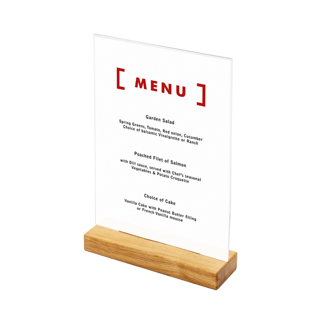 Ga voor een sterkere aantrekkingskracht voor elke horecagelegenheid of kantoorkantine met de veelzijdige Houten Menuhouder T Tafeldisplay. Ontworpen met een duurzame eikenhouten voet. Het is een musthave voor elk café, restaurant, hotel of kantine. De Houten Menuhouder T Tafeldisplay is een essentiële en tijdloze tafelstandaard met optimale functionaliteit. Kies een van de formaten: A4, A5 of A6. Er is altijd een formaat die aan de wensen voldoet. Of je nu menu’s, reclame, speciale aanbiedingen of aankondigingen wilt presenteren: De Houten Menuhouder T Tafeldisplay is de perfecte keuze voor elke promotie met een mooie look and feel.