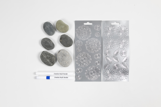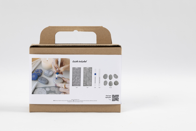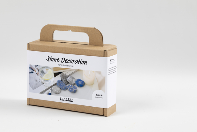 Met onze Creativity in a Box kunt u eenvoudige stenen omtoveren tot prachtige kunstwerken. Bevat materialen voor zes stenen en alle instructies die u nodig hebt. Begin uw eigen collectie decoratieve stenen te maken – het is leuk, eenvoudig en heerlijk ontspannend. Begin door uw favoriete stenen uit de doos uit te kiezen – groot, klein, rond of plat – en versier ze vervolgens met blauwe en witte markeerstiften met uw eigen ontwerpen. Gebruik de meegeleverde stickers of teken met de vrije hand en kijk hoe elke steen een uniek meesterwerkje wordt. Laat de verf drogen als u klaar bent en geniet ervan! U hebt nu mooie decoratieve stenen voor thuis, voor uw zomerhuisje of de tuin.