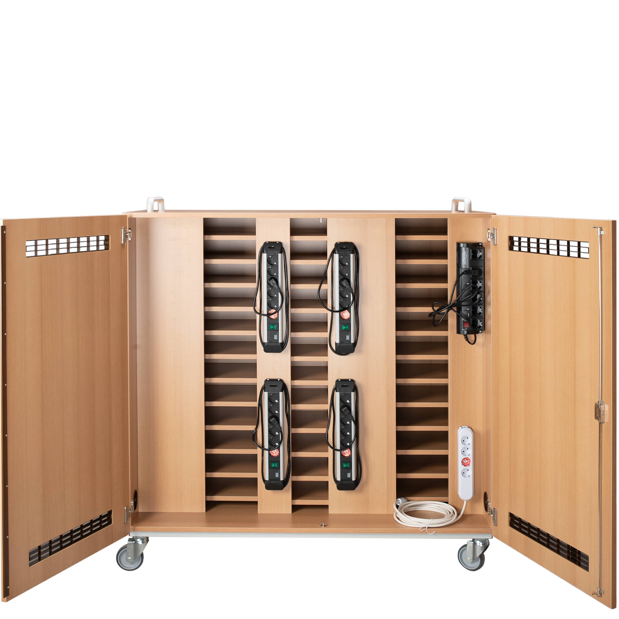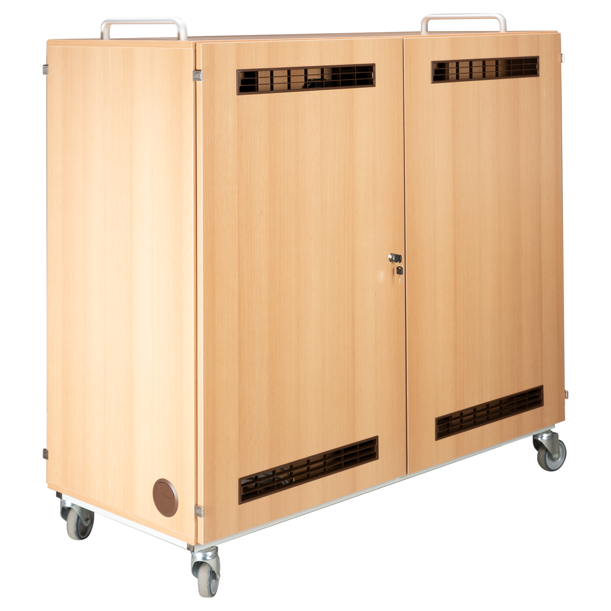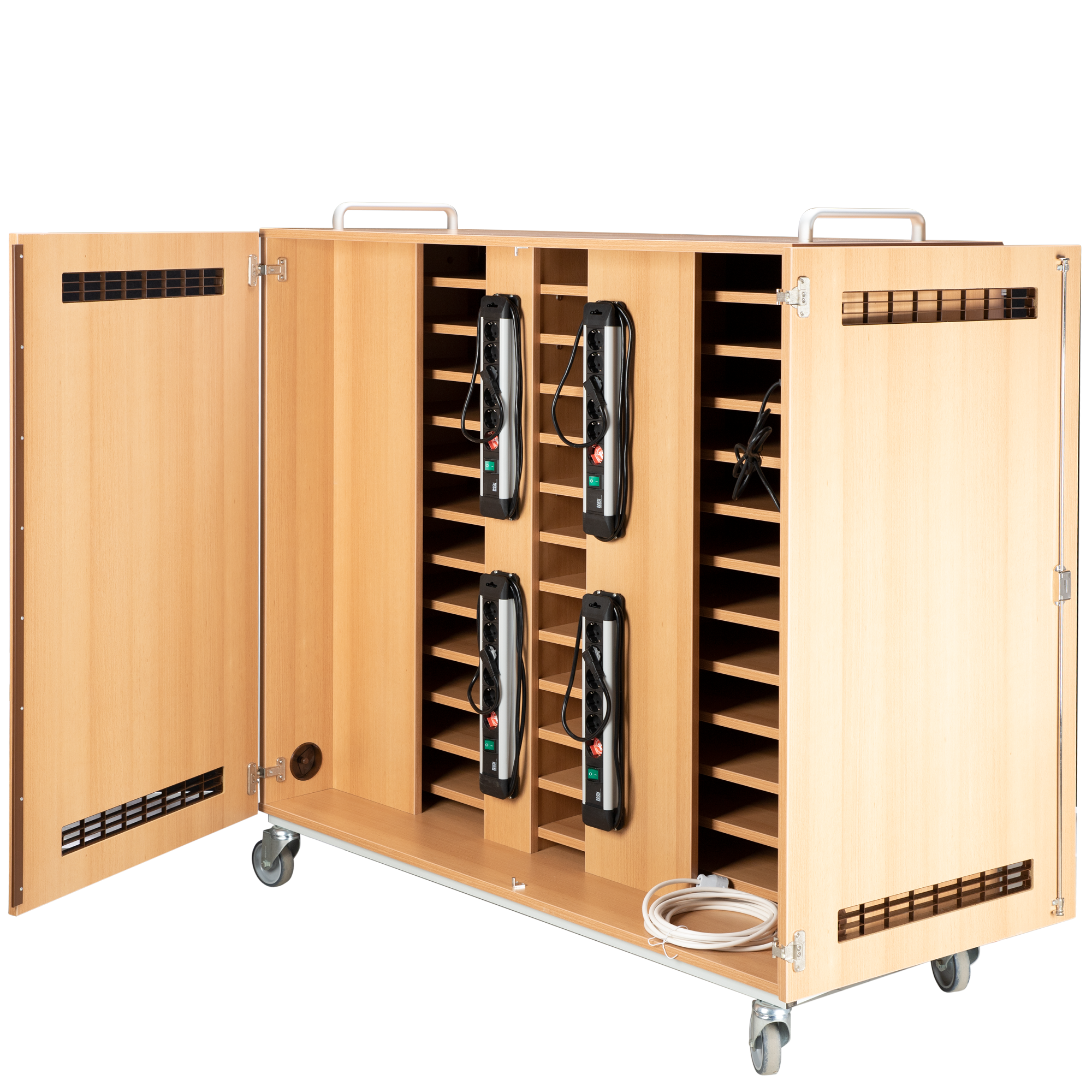 De laptopwagen heeft afsluitbare deuren aan de voor- en achterkant. Hij biedt plaats aan 24 laptops of 48 tablet-pc' s. In de laptoptrolley zijn stekkerdozen ingebouwd zodat de laptops in de kast opgeladen kunnen worden en er maar één kabel naar buiten loopt. Meerdere ventilatieroosters aan de achterkant zorgen voor voldoende luchtcirculatie. De binnenvakken zijn geschikt voor apparaten tot 17 inch. De laptoptrolley heeft 4 zwaar uitgevoerde zwenkwielen, waarvan er 2 kunnen worden vergrendeld om de laptoptrolley op de gewenste plek te fixeren.