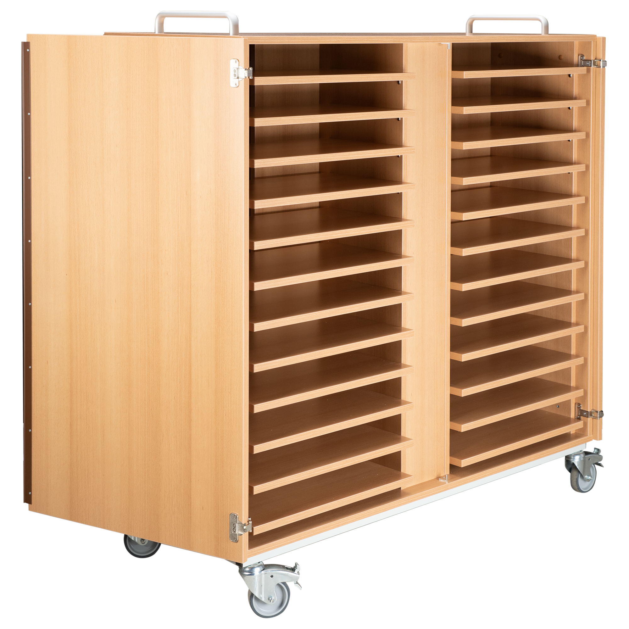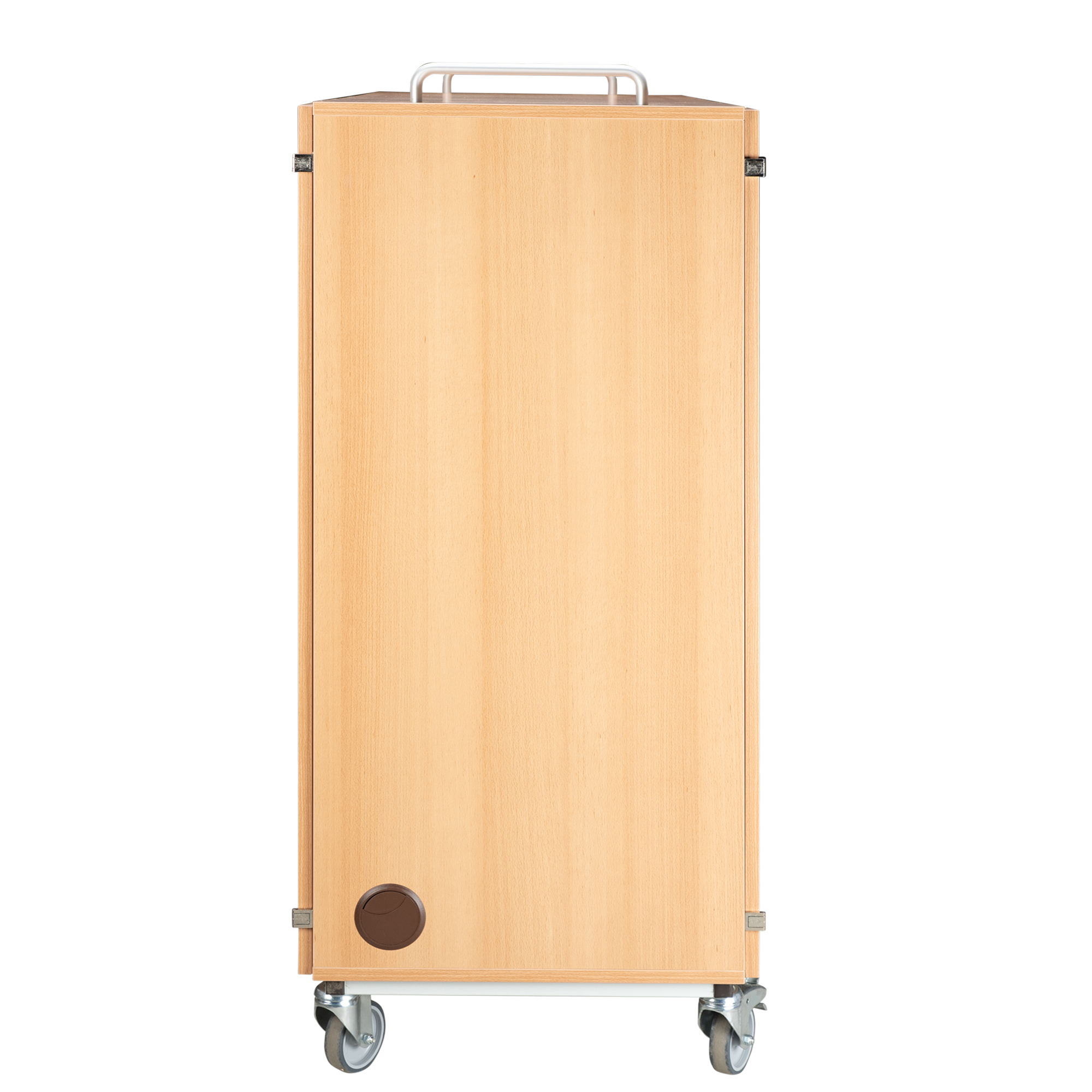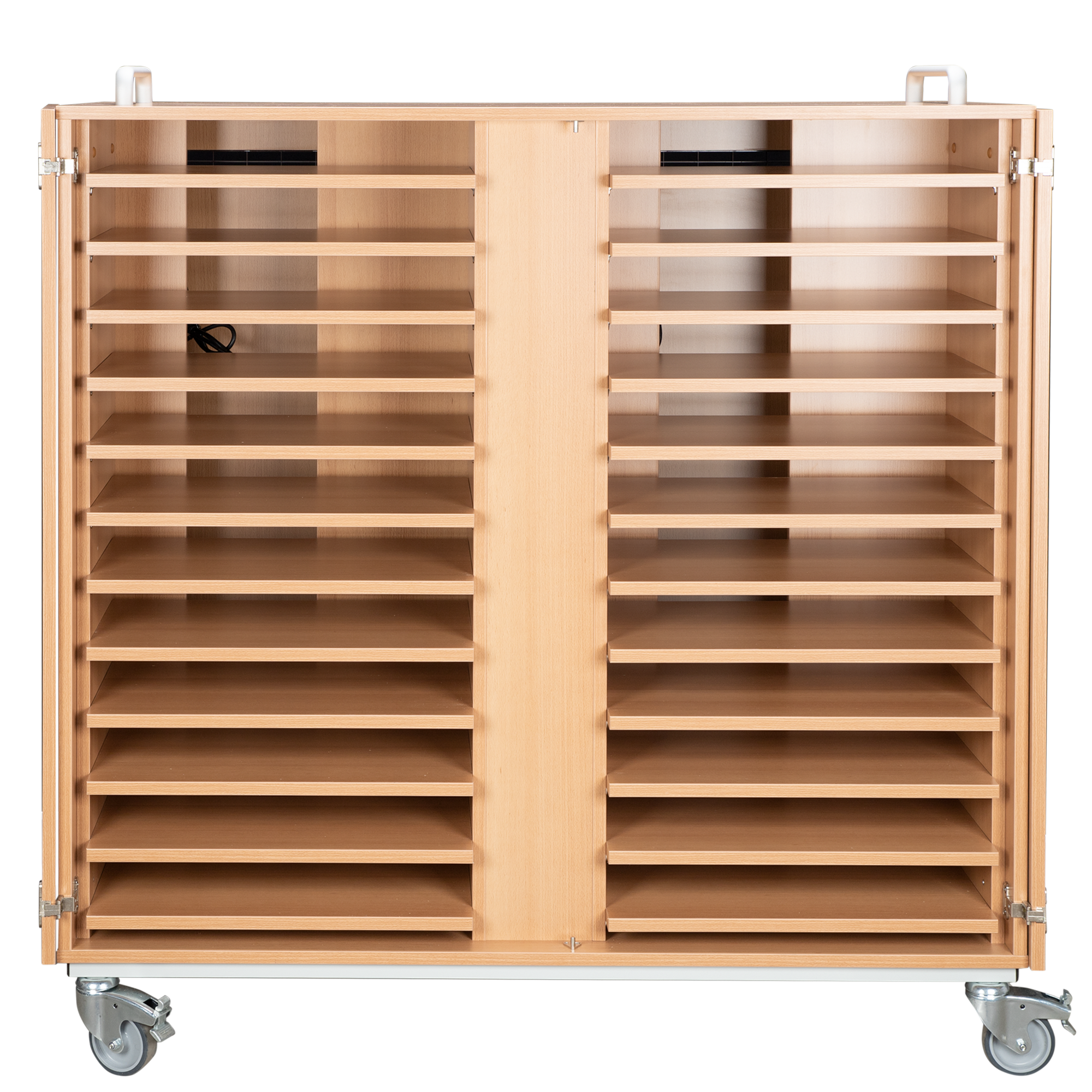 De laptopwagen heeft afsluitbare deuren aan de voor- en achterkant. Hij biedt plaats aan 24 laptops of 48 tablet-pc' s. In de laptoptrolley zijn stekkerdozen ingebouwd zodat de laptops in de kast opgeladen kunnen worden en er maar één kabel naar buiten loopt. Meerdere ventilatieroosters aan de achterkant zorgen voor voldoende luchtcirculatie. De binnenvakken zijn geschikt voor apparaten tot 17 inch. De laptoptrolley heeft 4 zwaar uitgevoerde zwenkwielen, waarvan er 2 kunnen worden vergrendeld om de laptoptrolley op de gewenste plek te fixeren.