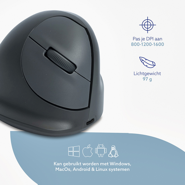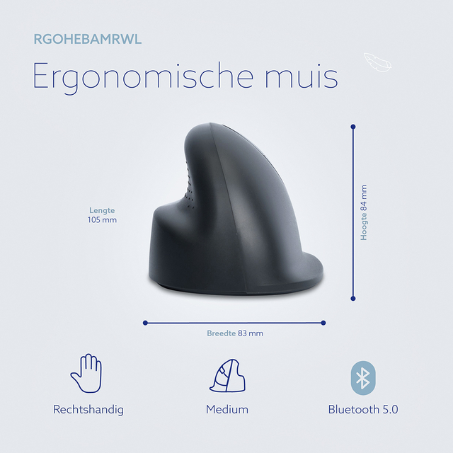 * De verticale R-Go HE Basic muis heeft een ronde vorm die de natuurlijke stand van je hand volgt. Dit zorgt ervoor dat je hand een ontspannen houding heeft tijdens muisgebruik. Het verticale design is bedoeld om de door ergonomen geadviseerde muisbeweging vanuit je onderarm te stimuleren. Op deze manier worden lichamelijke klachten zoals RSI voorkomen. * De muis beschikt over een speciale duimgoot en een pinkgoot, zodat alle vingers worden ondersteund. Deze draadloze muis kan eenvoudig worden verbonden via Bluetooth. * De R-Go HE Basic muis is aanvankelijk alleen verkrijgbaar voor rechtshandig gebruik in maat M. * Verticaal design. * Comfortabele grip. * Ondersteunt alle vingers. * Bluetooth verbinding. * Specificaties; * Grijs. * Materiaal: Kunststof. * Hand: Recht: 165-185. * Functie: Knoppen, scrollwiel. * Optisch. * Resolutie (DPI): 800-1200-1600. * Aantal knoppen: 3 knoppen. * Compatibiliteit: Windows, Mac OS, Linux. * Plug & play. * Bluetooth 5.0. * Draadloos bereik 10mtr * Lengte oplaadkabel 1020mm. * Afmeting 76x105x83mm (HxLxB).