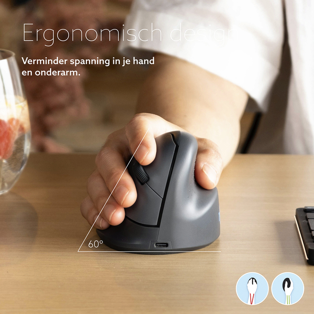 * De R-Go HE Break Muis is een ergonomische verticale muis met geïntegreerde pauzesoftware. Deze slimme muis helpt je herinneren wanneer het tijd is voor een pauze. De R-Go HE Break muis heeft een verticale stand, waardoor je de muis automatisch met je onderarm zult bewegen in plaats van alleen je hand. Hiermee voorkom je overbelastingsklachten, zoals RSI- klachten. * De HE Break muis heeft een ronde vorm, zodat je hand en pols in een natuurlijke, ontspannen stand staan. De muis ligt prettig in de hand en ondersteunt alle vingers. Ben je links- of rechtshandig? We hebben verschillende versies en maten beschikbaar, zodat de muis in elke hand past. De LED- kleursignalen in de muis geven aan hoe gezond je werkt en wanneer het tijd is voor een pauze. De muis stimuleert je om op frequente basis pauzes te nemen. Deze vitale onderbrekingen helpen om overbelasting te voorkomen, stimuleren de doorbloeding van het lichaam en houden je fit tijdens je werkdag. * Tijdens het muisgebuik verandert het lampje van kleur, zoals bij een stoplicht. Groen betekent ‘goed bezig’, oranje dat het tijd is voor een pauze, rood dat je te lang hebt doorgewerkt. Door gebruik te maken van deze subtiele kleursignalen ontvang je op een eenvoudige en positieve wijze feedback over gezond (pauze)gedrag. * Dit product werkt samen met de R-Go Break Software dat de Benelux Office Products Award 2021 heeft gewonnen. * Met pauze indicator. * Natuurlijke ergonomische vorm. * Stimuleert bloedcirculatie. * Rechtshandig. * Specificaties; *Lengte hand: ≤ 165. * Functie: Knoppen, scrollwiel. * Type: Optisch. * Resolutie (DPI): 400-800-1200-1600-2400. * Aantal knoppen: 5 knoppen * Aansluiting: Bluetooth 5.0. * Compatibiliteit: Windows, Mac OS, Linux. * Plug & play. * Inclusief USB-ontvanger. * Draadloos bereik 10mtr. * Inclusief oplaadkabel lengte 1020mm. * Afmeting 70x94x77mm (HxLXB).