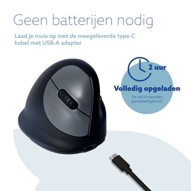 * De R-Go HE Break Muis is een ergonomische verticale muis met geïntegreerde pauzesoftware. Deze slimme muis helpt je herinneren wanneer het tijd is voor een pauze. De R-Go HE Break muis heeft een verticale stand, waardoor je de muis automatisch met je onderarm zult bewegen in plaats van alleen je hand. Hiermee voorkom je overbelastingsklachten, zoals RSI- klachten. * De HE Break muis heeft een ronde vorm, zodat je hand en pols in een natuurlijke, ontspannen stand staan. De muis ligt prettig in de hand en ondersteunt alle vingers. Ben je links- of rechtshandig? We hebben verschillende versies en maten beschikbaar, zodat de muis in elke hand past. De LED- kleursignalen in de muis geven aan hoe gezond je werkt en wanneer het tijd is voor een pauze. De muis stimuleert je om op frequente basis pauzes te nemen. Deze vitale onderbrekingen helpen om overbelasting te voorkomen, stimuleren de doorbloeding van het lichaam en houden je fit tijdens je werkdag. * Tijdens het muisgebuik verandert het lampje van kleur, zoals bij een stoplicht. Groen betekent ‘goed bezig’, oranje dat het tijd is voor een pauze, rood dat je te lang hebt doorgewerkt. Door gebruik te maken van deze subtiele kleursignalen ontvang je op een eenvoudige en positieve wijze feedback over gezond (pauze)gedrag. * Dit product werkt samen met de R-Go Break Software dat de Benelux Office Products Award 2021 heeft gewonnen. * Met pauze indicator. * Natuurlijke ergonomische vorm. * Stimuleert bloedcirculatie. * Rechtshandig. * Specificaties; *Lengte hand: ≤ 165. * Functie: Knoppen, scrollwiel. * Type: Optisch. * Resolutie (DPI): 400-800-1200-1600-2400. * Aantal knoppen: 5 knoppen * Aansluiting: Bluetooth 5.0. * Compatibiliteit: Windows, Mac OS, Linux. * Plug & play. * Inclusief USB-ontvanger. * Draadloos bereik 10mtr. * Inclusief oplaadkabel lengte 1020mm. * Afmeting 70x94x77mm (HxLXB).