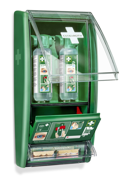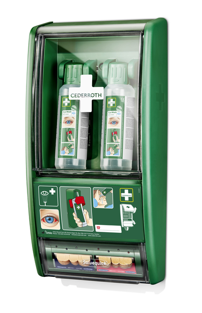 * Cederroth oogdouche bewezen effectiever dan een fysiologische zoutoplossing bij spetters alkaliën en zuren. * Cederroth oogdouchestation is ontworpen om snel hulp te kunnen bieden. Het station heeft plaats voor 2 flessen die automatisch worden geopend wanneer ze uit de houder worden gedraaid. De flessen zijn zo vormgegeven dat het oog gedurende ca. 1,5 minuut met een rijke stroom wordt gespoeld. 4,5 jaar houdbaarheidstermijn. * Cederroth oogdouche werkt zodanig dat de pH-waarde van het oog wordt geneutraliseerd, d.w.z. deze heeft een neutraliserend effect op spetters alkaliën en zuren, wat een sneller resultaat geeft dan een normale fysiologische zoutoplossing. Het effect is over het algemeen sterker op alkaliën dan zuren. * Met de Salvequick pleisterautomaat zijn de pleisters altijd beschikbaar en klaar voor gebruik. U trekt de pleisters omlaag uit de automaat om te voorkomen dat de overige pleisters vuil worden gemaakt of dat er bloed op komt. De pleisternavullingen zitten muurvast in de automaat om ervoor te zorgen dat zij niet verdwijnen. Door de extra ruimte voor andere producten kunt u de inhoud van uw station aanpassen aan de specifieke behoeften van uw werkplek. * Inhoud: 2 Cederroth oogdoucheflessen à 500 ml Salvequick pleisterautomaat incl. 40 textiel- en 45 plasticpleisters 1 oogdouche-instructie 1 sleutel * Soort letsel: Oogletsels / Wonden.