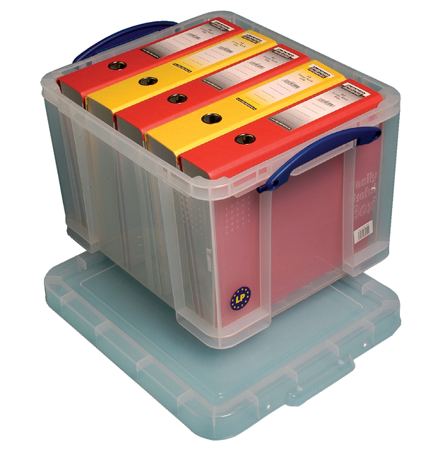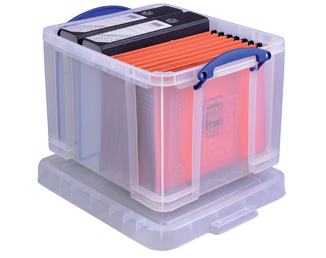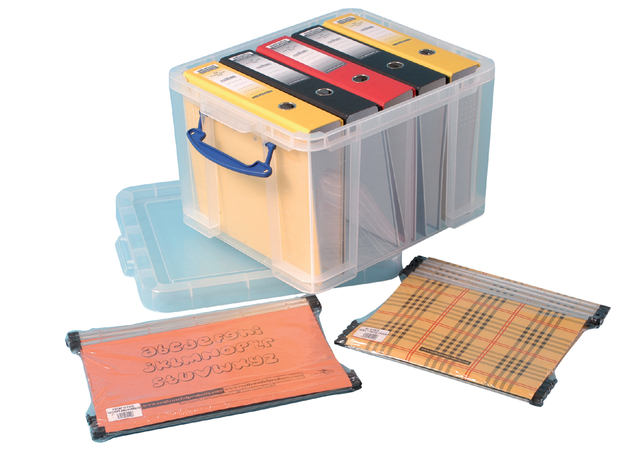 * Really Useful opbergboxen zijn stapelbaar met of zonder deksel. * Ze zijn zo sterk dat het het gewicht van één persoon houdt. * Elk product is bestendig tegen temperaturen van -15°C tot +80°C. * Minimale zijkant aanpassingen om opbergruimte te maximaliseren, dit zorgt tevens ook dat de inhoud minder kan bewegen tijdens transport. * Volledig platte en versterkte bodem. * Het sluitmechanisme houdt de doos en het deksel tezamen. * De doorzichtige doos heeft het voordeel dat u steeds de inhoud ziet. * De verschillende afmetingen zijn onderling opstapelbaar. * Perfect voor A4 ringbanden, ordners en/of hangmappen. * Het aantal hangmappen is afhankelijk van de dikte van de dossiers. *Buitenmaat 480x390x310 mm (lxbxh). *Binnenmaat 370x310x280 mm (lxbxh).