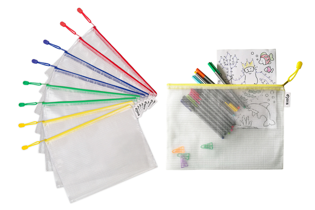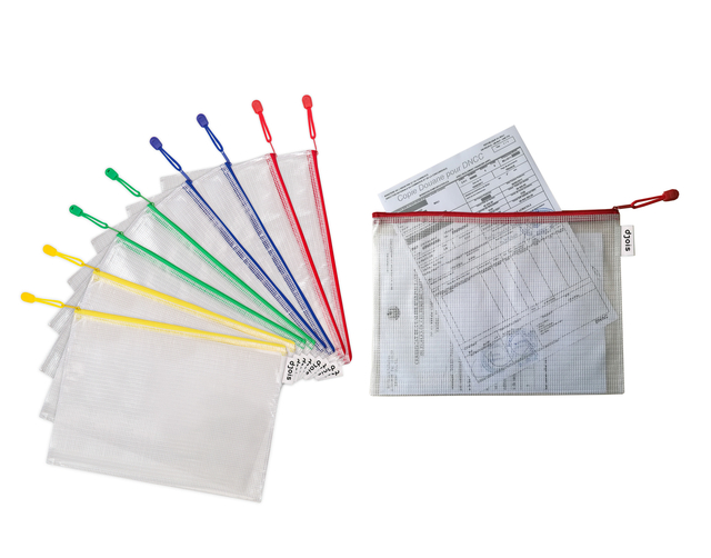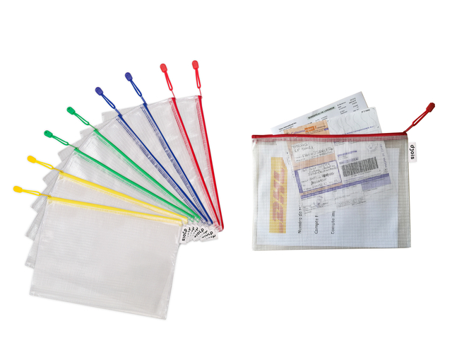 Versterkte opbergtassen met ritssluiting verkrijgbaar in 4 maten en 4 kleuren voor een organisatie in kleurenthema. Perfect om uw documenten of kleine voorwerpen veilig te beschermen en mee te nemen. Een stoer en betrouwbaar accessoire voor op kantoor, in de fabriek, thuis, op school of op reis. Productbeschrijving: * Versterkte transparante opbergtassen van A4-formaat met ritssluiting. * Gekleurde ritsen * Ook verkrijgbaar in andere maten. Productvoordelen: * Ultrabestendig, duurzaam versterkt materiaal dat stijl en robuustheid combineert. * REACH-conform materiaal zonder ftalaten. * Grijpband voor het gemakkelijk openen en sluiten van de tas. * Door de transparantie van het materiaal kan de inhoud worden doorzien en geïdentificeerd. * Etiket kan gebruikt worden als pennenhouder. * Scheurvast. Gebruik: Voor kantoor, fabriek, thuis, op school of op reis. Perfect om kleine voorwerpen en documenten tot A4-formaat te beschermen en mee te nemen. Monsters, documenten, dossiers, tijdschriften, kranten, school- en kantoorbenodigdheden, gereedschap, reserveonderdelen, spelonderdelen, elektronische apparaten, kleding, toiletartikelen, enz. Technische specificaties: * Flexibel gaas versterkt PVC. * Metalen rits. * Interne afmetingen: 325 x 235 mm. * Externe afmetingen: 330 x 240 mm.