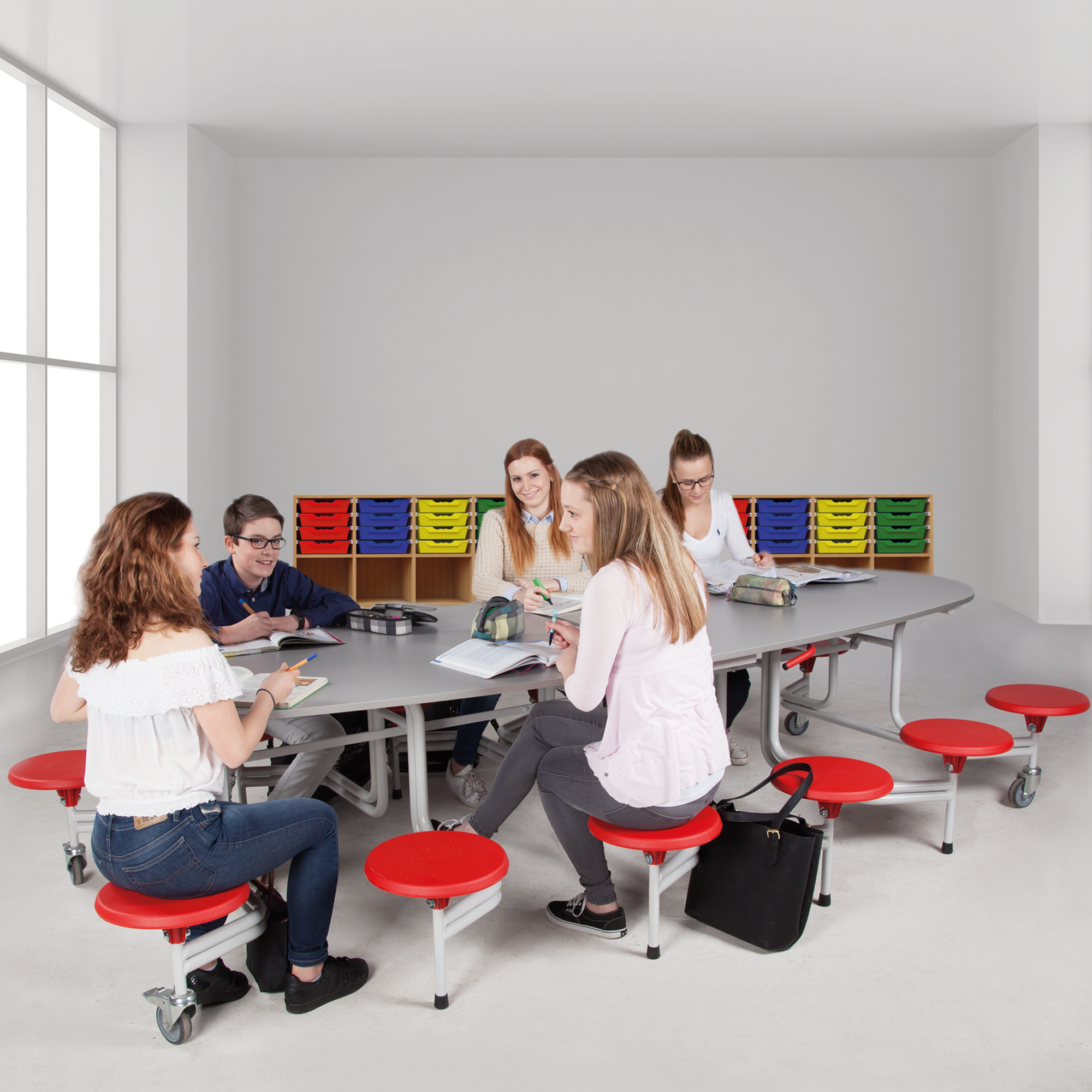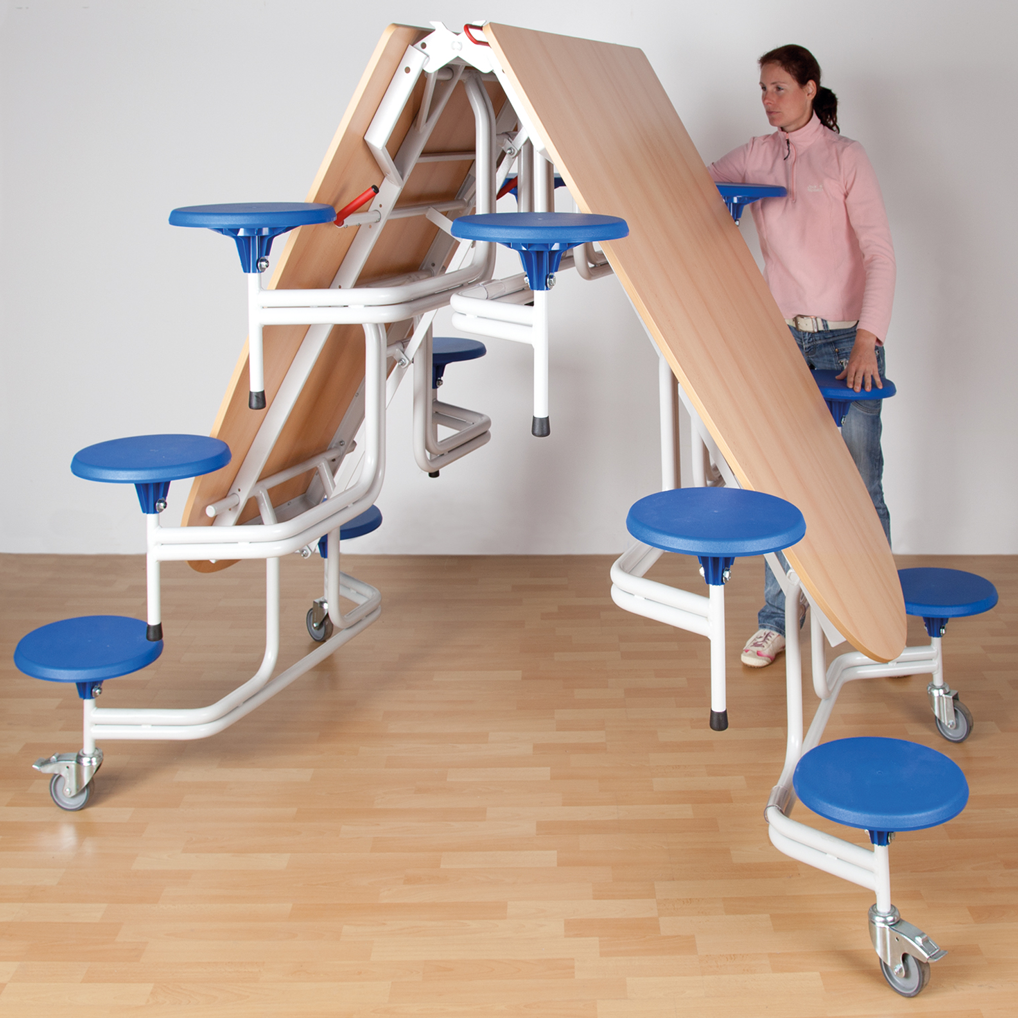 Een grote vrije ruimte - en slechts een paar minuten later een volledig zittende kantine! Ingeklapt zijn de verrijdbare tafels zeer mobiel en dankzij het praktische klapmechanisme zeer eenvoudig op te zetten. De transportvergrendeling maakt een veilige hantering mogelijk. Dit is bijzonder praktisch voor de hygiëne en het onderhoud van de kamer. Als de tafels eenmaal zijn samengevouwen, is het niet nodig om stoelen op de tafels te zetten of om de tafelpoten te vegen. De 19 mm dikke E1-spaanplaat met melamineharscoating en ABS-rand is bijzonder onderhoudsvriendelijk en kan uiteraard met een vochtige doek worden afgenomen. Het frame is altijd verkrijgbaar in RAL 7035, lichtgrijs.