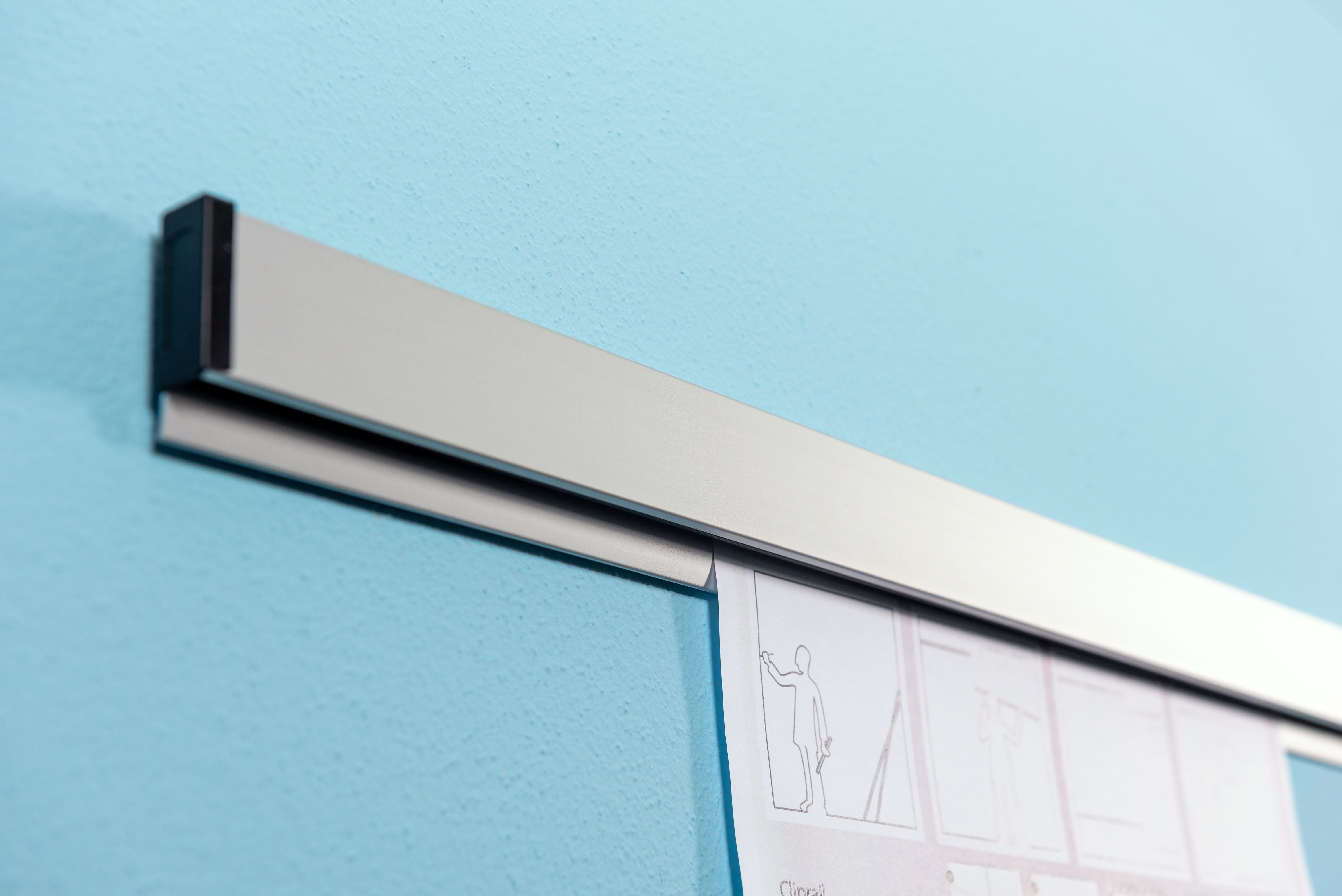 Wandrailsysteem waarin tekeningen, posters, etc., zonder beschadiging en snel opgehangen kunnen worden. Verkrijgbaar in lichtgrijs aluminium in 100 cm en 200 cm. Voorgeboord geleverd inclusief ophangmateriaal.