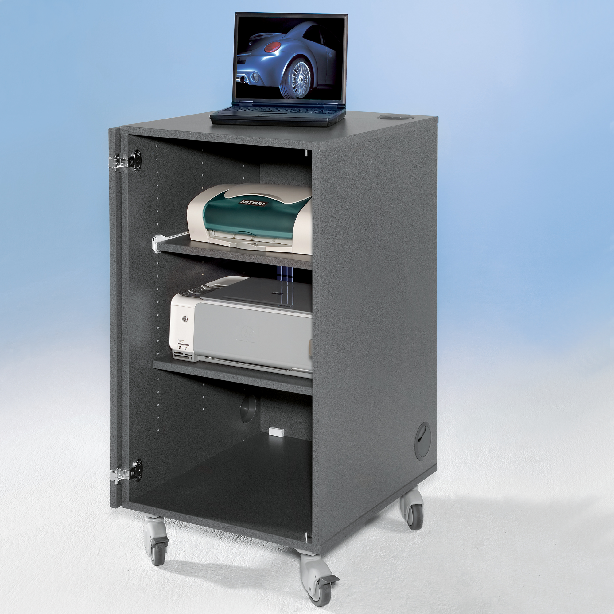 Onze phono-/mediatrolley met kabeluitgangen in de zijkanten en deksel, afsluitbare voordeur en afneembare achterwand is met zijn vier zwenkwielen, waarvan er twee vergrendelbaar zijn, mobiel te gebruiken. Een toetsenbordverlenging bevindt zich op een hoogte van 72 cm. Er is ook een verstelbare plank binnenin. De ventilatiesleuven aan de achterkant voorkomen dat de apparaten oververhit raken.