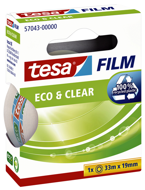 * tesafilm® eco & clear is een milieuvriendelijke en vrijwel onzichtbare tape die gerecycleerde materialen combineert met hoogwaardige prestaties. * Als je op zoek bent naar tape met groene eigenschappen en superieure kwaliteit, is tesafilm® eco & clear het antwoord. * Dit milieuvriendelijke bureauaccessoire is vrij van pvc en oplosmiddelen en is gemaakt van 100% gerecycleerd kunststof. * De kern en verpakkingsmaterialen zijn gemaakt van 100% gerecycleerd karton. * De lijmlaag van dit doorzichtige plakband garandeert sterke hechting en hoge uv-bestendigheid. * Omdat het een zeer transparante tape is, blijft tesafilm® eco & clear onzichtbaar op de meeste oppervlakken. * De tape rolt stil af en is te gebruiken met een van de tesafilm® dispensers. * Lengte 33mx19mm.