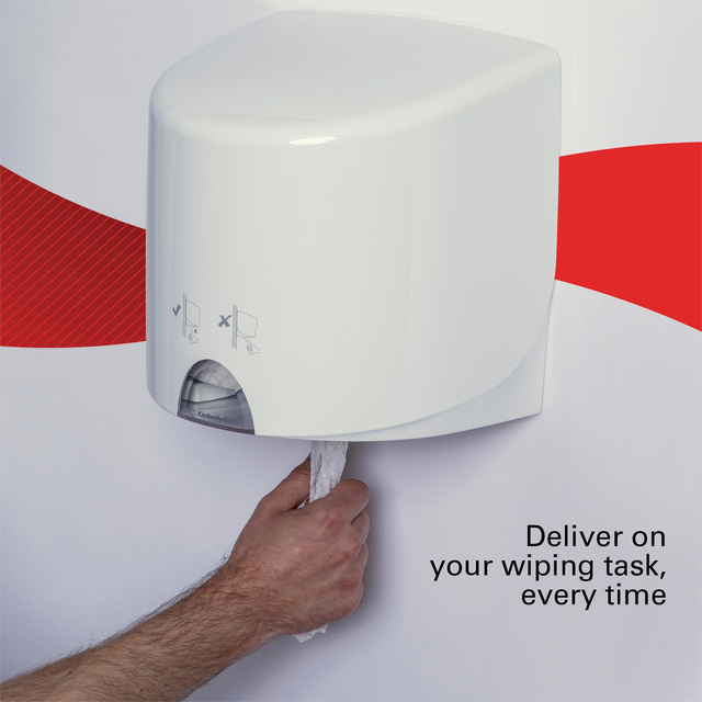 * WypAll L10-poetsdoeken voor detailhandel en dienstenomgevingen 7406 - 6 poetsdoekrollen x 500 witte papieren poetsdoeken (3000 in totaal) * Ongeacht met welke oppervlakken uw werknemers en bezoekers de hele dag in aanraking komen, u geeft ze meer gemoedsrust door beproefde reinigings- en desinfectieoplossingen voor de hygiëne van de werkplek te bieden die de overdrachtketen van ziektekiemen helpen verbreken. * WypAll L10-poetsdoeken voor detailhandel en dienstenomgevingen zijn zodanig ontworpen dat u elke poetstaak aankunt. Deze geperforeerde centrefeedrollen van één vel met merkreliëf zijn middelgroot en hebben een hoge capaciteit. * De compacte poetsdoeken met meer vellen per rol hoeven minder vaak bijgevuld te worden en zorgen voor minder vrachtwagens op de weg, waardoor u hogere duurzaamheidsnormen kunt behalen door uw CO2-uitstoot en afval te verminderen. * Onze unieke Airflex-technologie zorgt voor uitzonderlijke stevigheid en absorptievermogen in elke papieren poetsdoek. De veelzijdige, witte, 1-laags papieren poetsdoekrollen kunnen binnen of buiten een dispenser worden gebruikt om aan uw behoeften te voldoen. * WypAll L10-poetsdoeken voor detailhandel en dienstenomgevingen zijn compatibel met onze draagbare WypAll ReachPlus-dispenser (6521) en onze wandgemonteerde Aquarius Roll Control-dispensers in wit (7018) en grijs (7181), met gebruik van de bestaande rode plaat. Deze eenvoudig te reinigen poetsdoekdispensers met snellaadfunctie bieden betrouwbaardere oplossingen voor het afgeven van losse vellen. Gecontroleerde afgifte van één vel vermindert het aantal gebruikte poetsdoeken en zorgt ervoor dat de gebruiker alleen het vel aanraakt dat nodig is, voor maximale hygiëne en betere kostenbeheersing. Deze papieren WypAll-poetsdoeken kunnen eenmalig worden gebruikt met reinigingsmiddel of desinfectiemiddel. * Deze Kimberly-Clark-poetsdoeken zijn getest en geschikt bevonden voor gebruik met sprays die perazijnzuur, waterstofperoxide en 'quats' (quaternaire ammoniumverbindingen) bevatten. Dankzij de geschiktheid voor bevochtiging met een spray en schoonvegen, kunnen werknemers hun eigen werkplek, voertuig, bureau, stoel en voedselbereidingsruimte voor en na gebruik schoonvegen. Sproeien en afvegen helpt productiemedewerkers ook om hun eigen werkstation schoon te maken/te ontsmetten voordat ze deze aan de volgende werkploeg overdragen. Voor omgevingen waar schoonvegen met een volledig doordrenkte poetsdoek een vereiste is, zijn deze WypAll-schoonmaakrollen getest en geschikt bevonden voor sop/schoonmaakmiddel. Volg altijd de instructies van de fabrikant voor verdunning, toepassing en contacttijd op. * Deze WypAll L10-centrefeed rollen zijn ontworpen voor de detailhandel en dienstenomgevingen. * Elk afzonderlijke poetsdoek heeft een afmeting van 38 cm (L) x 18,3 cm (B).