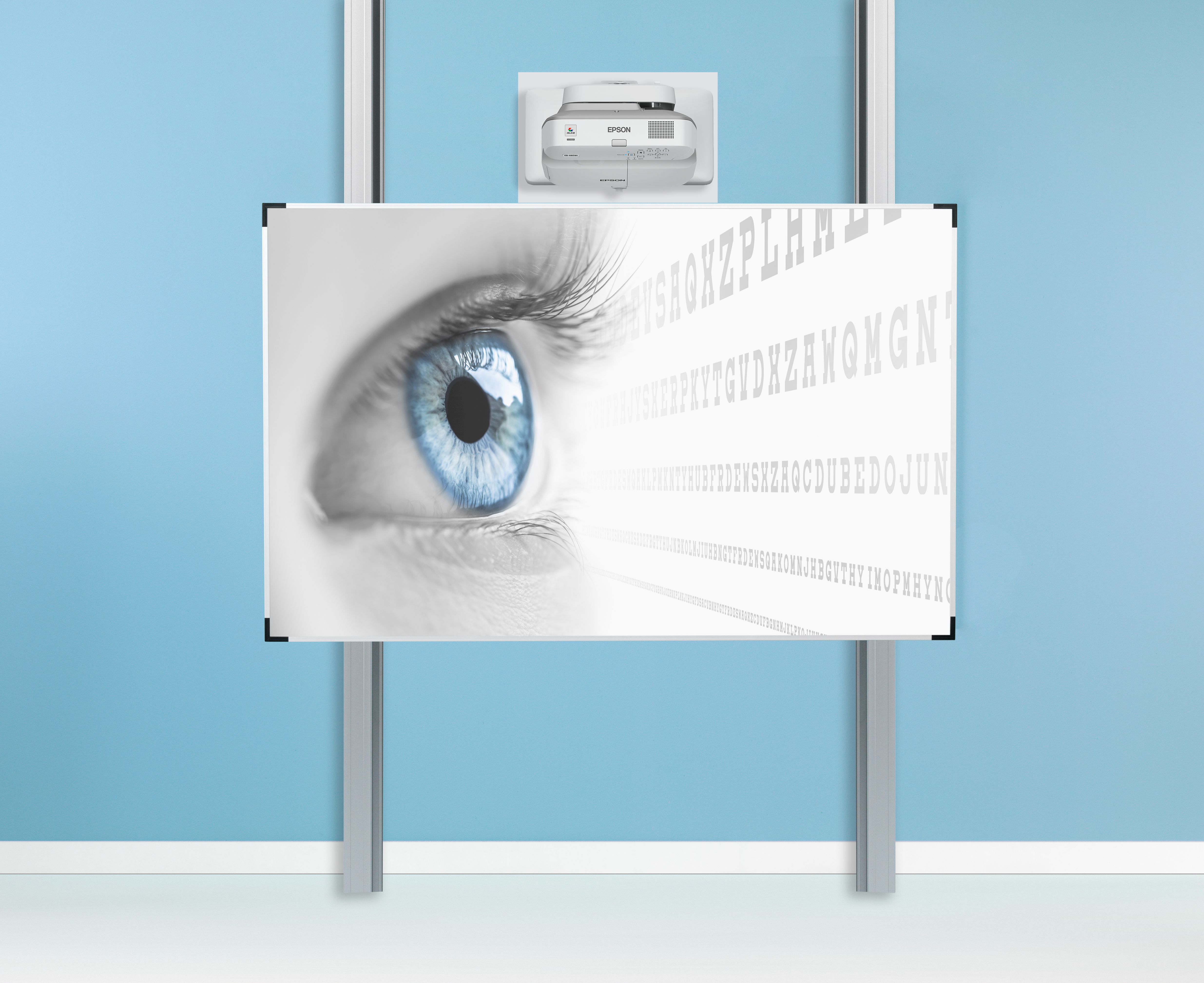 Projectiebord voor interactieve finger-touch projectoren (16:10), zoals bijv. Epson EB-695Wi en EB-725Wi. Zeer dunne en lichte constructie met vlak opliggend aluminium profiel. Oppervlak: Low Gloss emailstaal. Inclusief 2 aluminium afleggoten van 31 cm. Kolomborden traploos in hoogte verstelbaar, zeer stabiele constructie. Magneethoudend en droog uitwisbaar.