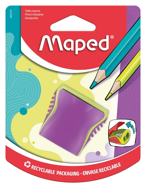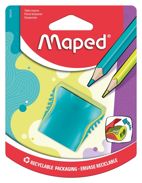 * Puntenslijper. * Ultra compact, dus makkelijk mee te nemen. * Met opvangbakje. * Scharnierend deksel, je raakt het dus niet kwijt. * Voor normale en dikke potloden. * Schokbestendig: onbreekbare materialen. * 2 verschillende kleuren, 3 kleurcombinaties. * Verpakkingseenheid pak Ă 5 blisters.* Aantal gaten: 2.
