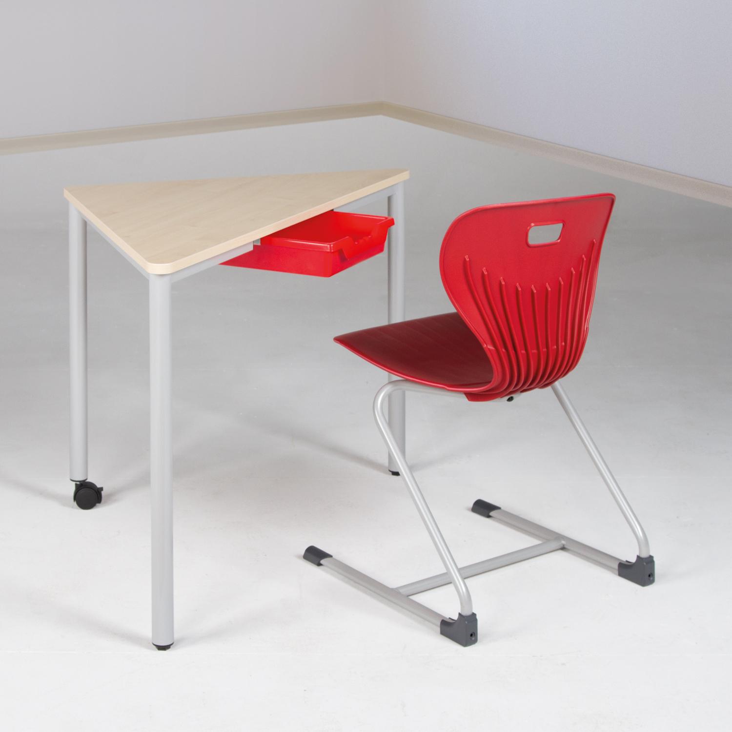 Driehoekige tafel met geïntegreerde ErgoTray Box (C1) uit onze ErgoTray kast- en plankoplossingen. De driehoekige tafels van Pythagoras hebben een zwenkwiel op één poot (hoek van 90°) en zijn daardoor verrijdbaar. De voeten zijn voorzien van kunststof glijders. Het frame bestaat uit ronde stalen buis (40/2 mm), rondom gelast frame, gepoedercoat volgens RAL. De tafelhoogte kan worden gekozen volgens DIN of in de standaard tafelhoogte van 72 cm.