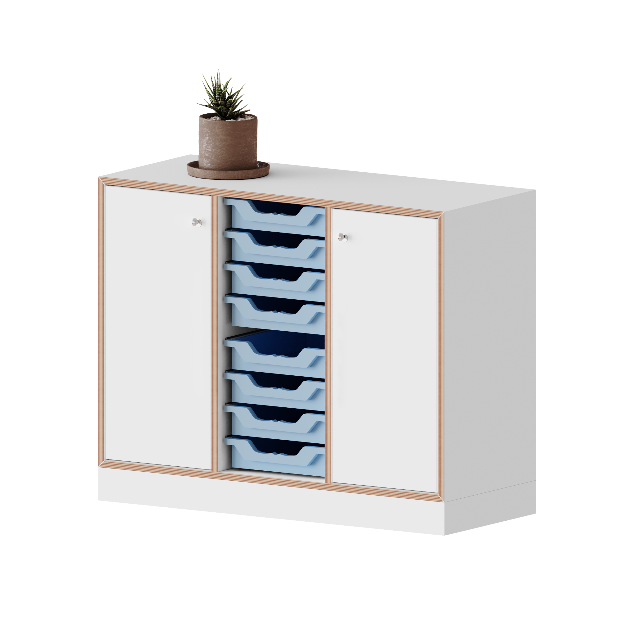 Qickly® kast, 2 ordnerhoogtes. 2 deuren met slot, 8 kleine Ergo dienbladdozen - B/H/D: 104,2x74,3x42,6 cm