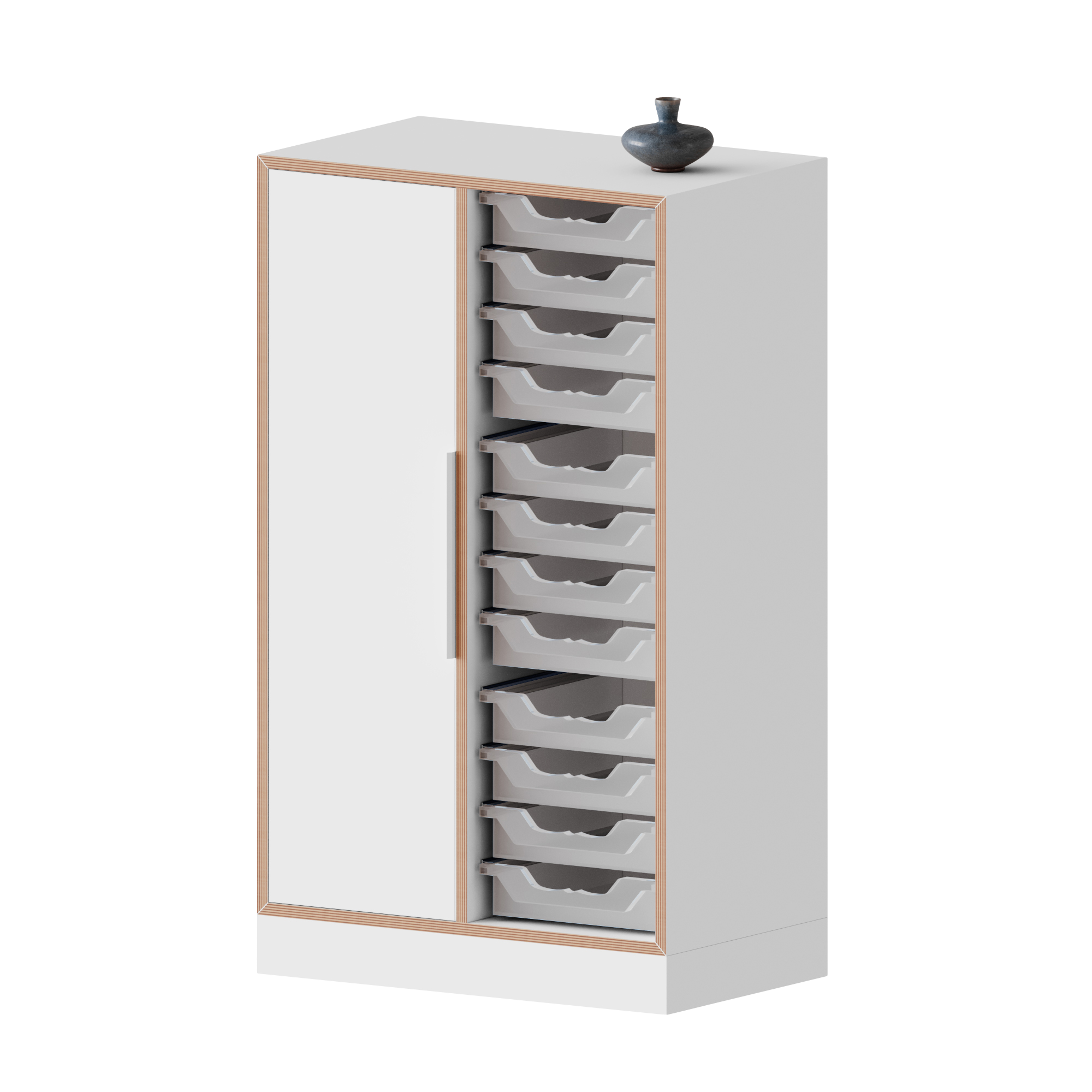 Ons qickly® kastsysteem overtuigt door zijn 45 graden verstek en ABS-rand in multiplex-look. De lichaamskleur is witte melamine. Dit ultramoderne ontwerp maakt het klaslokaal en kantoor tot een echte eyecatcher. De kast maakt indruk met veel opbergruimte en mobiliteit, waardoor hij zowel in scholen als kantoren zijn plaats vindt. Het bevat 12 kleine Ergo Tray-dozen waarin al uw documenten georganiseerd kunnen worden. Daarnaast is het kastensysteem op ieder moment uit te breiden en desgewenst ook te bestellen met een set wielen waarvan er twee afsluitbaar zijn. De voethoogte bedraagt 8,6 cm. Bij gebruik van optioneel verkrijgbare zwenkwielen verandert de basishoogte niet. De materiaaldikte van de wanden en planken bedraagt 19 mm, de vaste achterwand is 8 mm dik en garandeert een hoge stabiliteit. De kast wordt gedemonteerd aan u geleverd inclusief montagehandleiding, zodat u deze zelf kunt monteren. Zoals de naam van ons productassortiment al doet vermoeden, overtuigt het qickly® kast- en stellingsysteem door zijn snelle levering. Qickly® - Slim. Bijna. Eenvoudig.