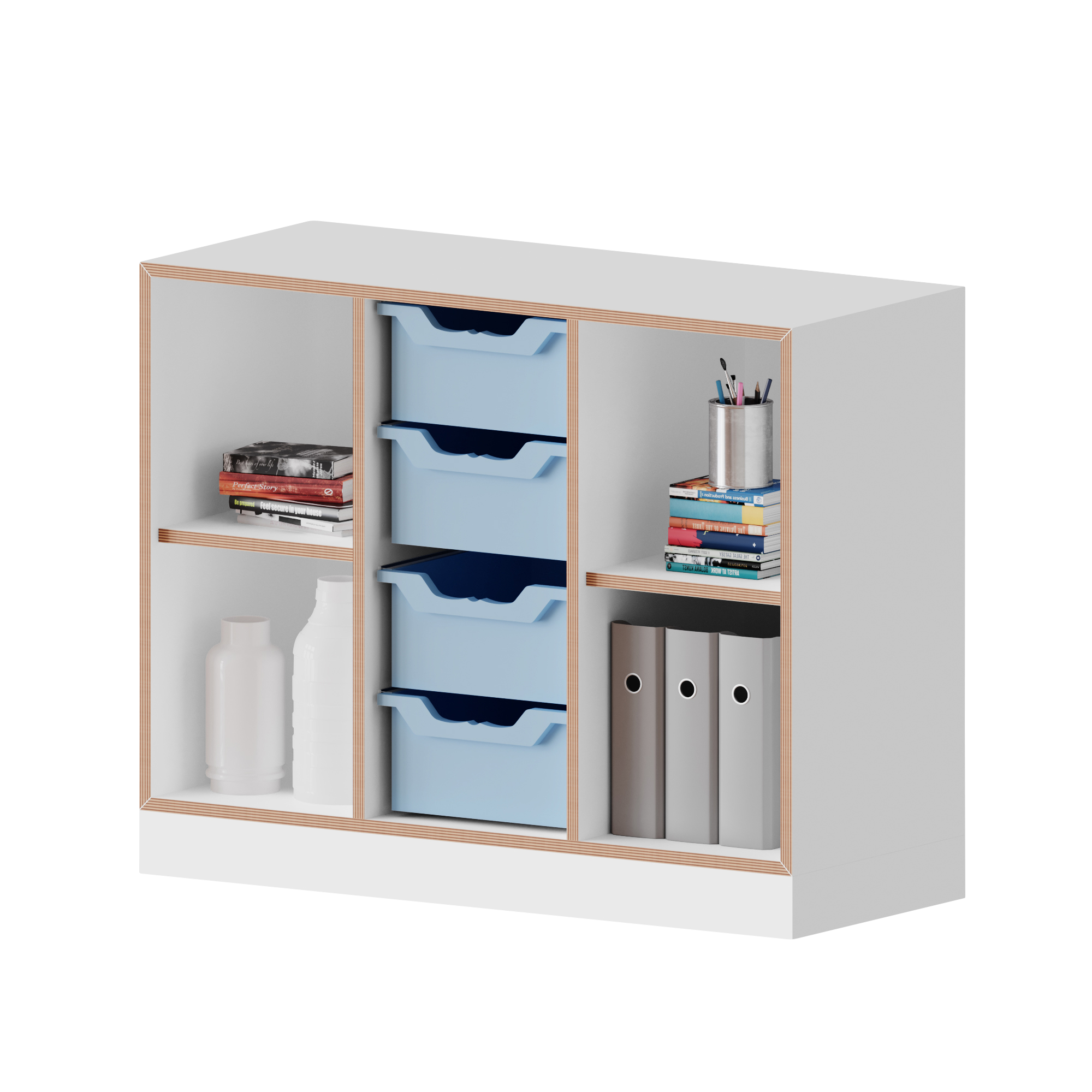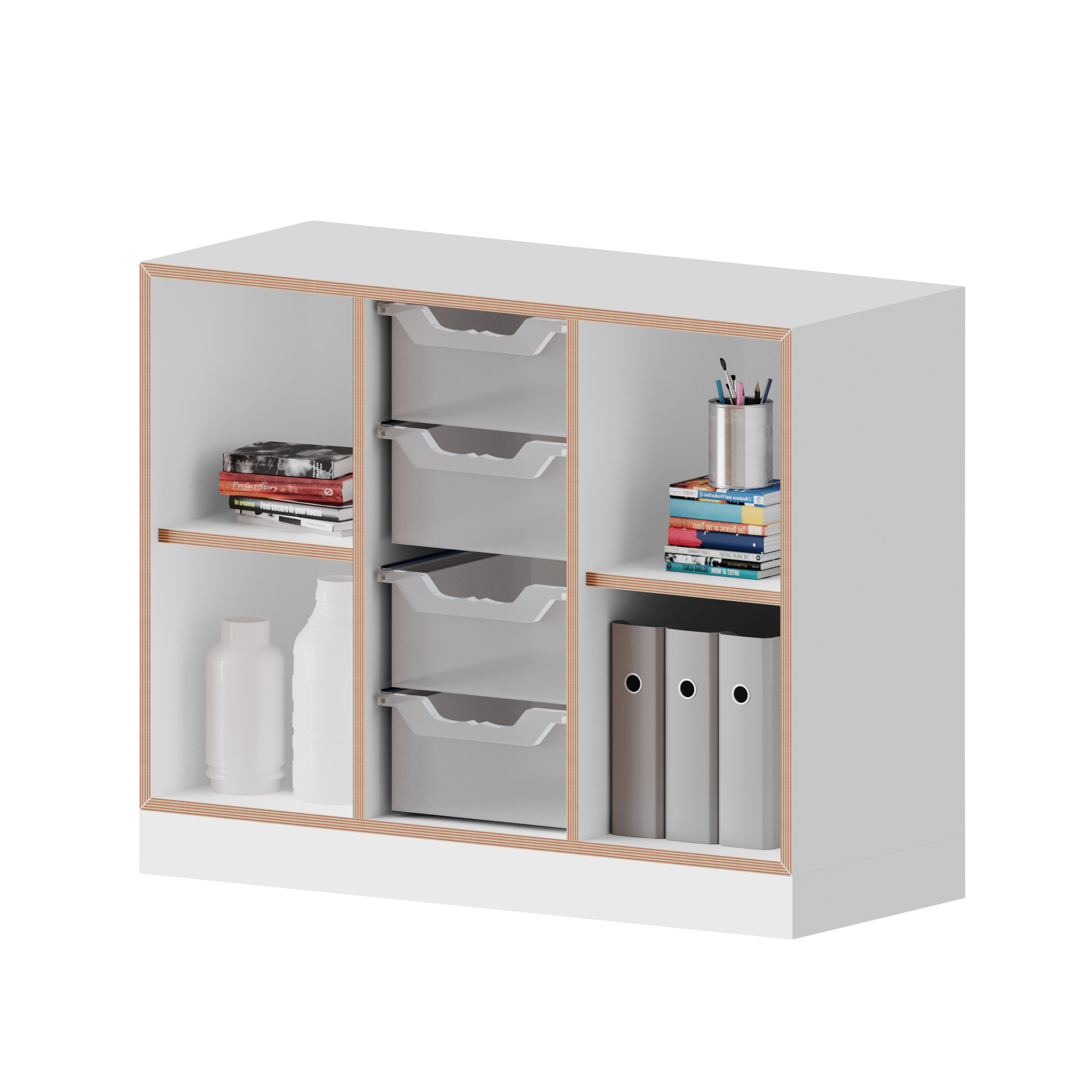 Ons qickly® rekkensysteem overtuigt door zijn 45 graden verstek en ABS-rand in multiplex-look. De lichaamskleur is witte melamine. Dit ultramoderne ontwerp maakt het klaslokaal en kantoor tot een echte eyecatcher. De plank overtuigt door veel opbergruimte en mobiliteit, waardoor hij zowel in scholen als op kantoren zijn plaats vindt. Er worden 4 grote Ergo Tray dozen meegeleverd waarin al uw documenten georganiseerd kunnen worden. Daarnaast is het kastensysteem op ieder moment uit te breiden en desgewenst ook te bestellen met een set wielen waarvan er twee afsluitbaar zijn. De voethoogte bedraagt 8,6 cm. Bij gebruik van optioneel verkrijgbare zwenkwielen verandert de basishoogte niet. De materiaaldikte van de wanden en planken bedraagt 19 mm, de vaste achterwand is 8 mm dik en garandeert een hoge stabiliteit. De kast wordt gedemonteerd aan u geleverd inclusief montagehandleiding, zodat u deze zelf kunt monteren. Zoals de naam van ons productassortiment al doet vermoeden, overtuigt het qickly® kast- en stellingsysteem door zijn snelle levering. Qickly® - Slim. Bijna. Eenvoudig.