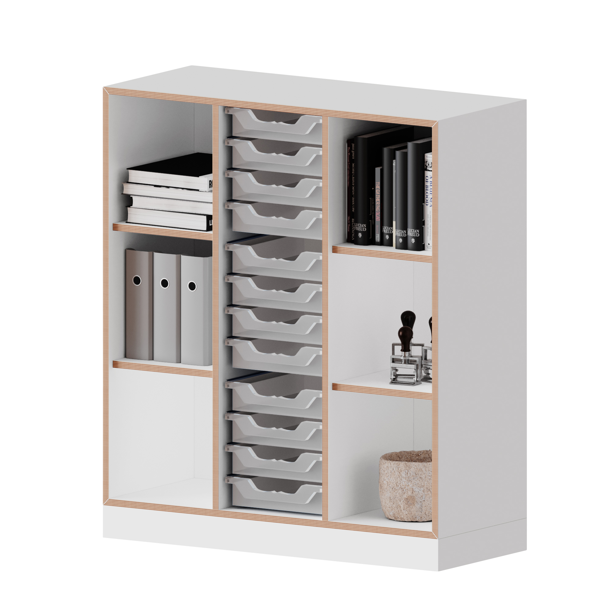 Ons qickly® rekkensysteem overtuigt door zijn 45 graden verstek en ABS-rand in multiplex-look. De lichaamskleur is witte melamine. Dit ultramoderne ontwerp maakt het klaslokaal en kantoor tot een echte eyecatcher. De plank overtuigt door veel opbergruimte en mobiliteit, waardoor hij zowel in scholen als op kantoren zijn plaats vindt. Het bevat 12 kleine Ergo Tray-dozen waarin al uw documenten kunnen worden georganiseerd. Bovendien is het rekkensysteem op elk moment uit te breiden en desgewenst ook te bestellen met een set wielen, waarvan er twee afsluitbaar zijn. De voethoogte bedraagt 8,6 cm. Bij gebruik van optioneel verkrijgbare zwenkwielen verandert de basishoogte niet. De materiaaldikte van de wanden en planken bedraagt 19 mm, de vaste achterwand is 8 mm dik en garandeert een hoge stabiliteit. De kast wordt gedemonteerd aan u geleverd inclusief montagehandleiding, zodat u deze zelf kunt monteren. Zoals de naam van ons assortiment al doet vermoeden, overtuigt het qickly® kast- en stellingsysteem door zijn snelle levering. Qickly® - Slim. Bijna. Eenvoudig.