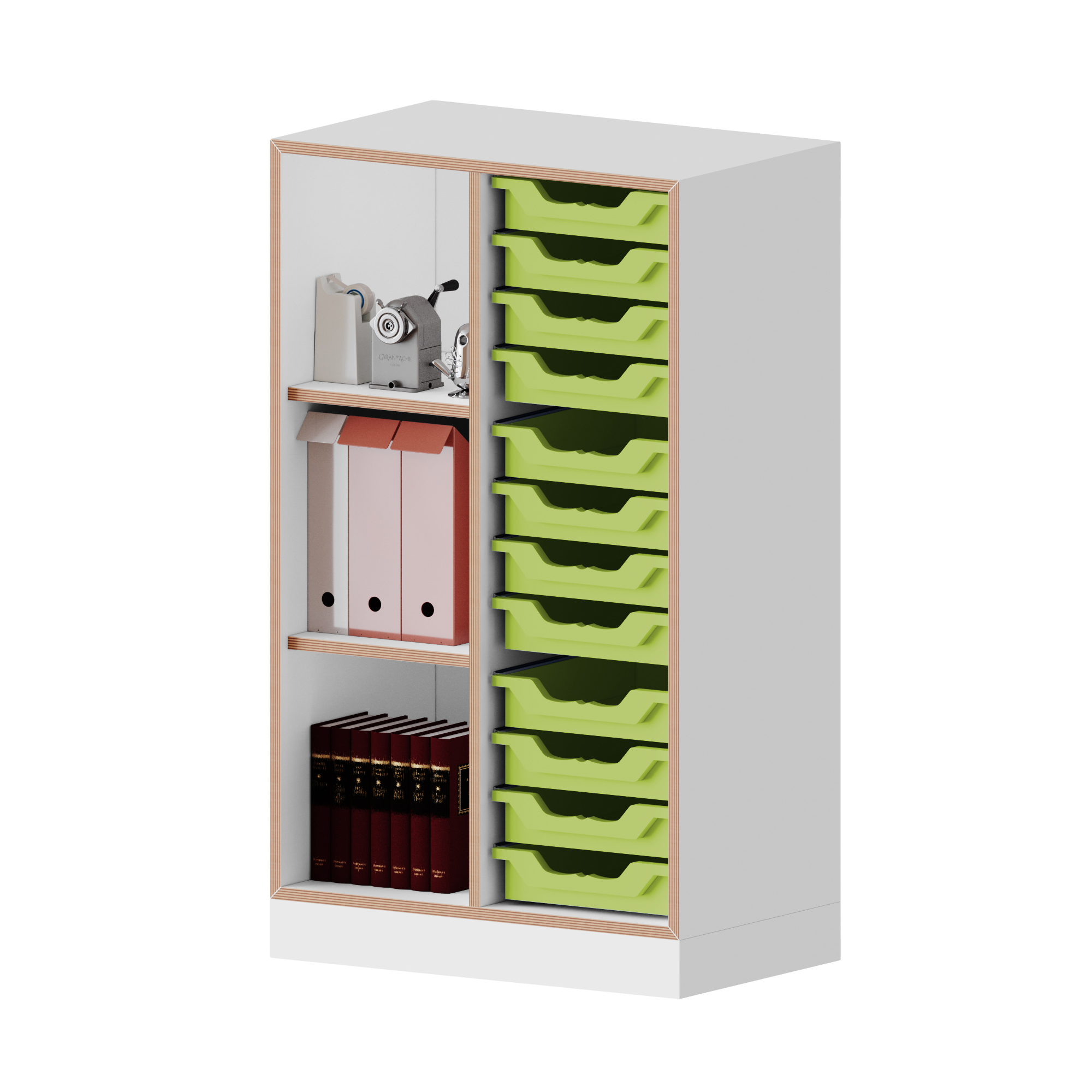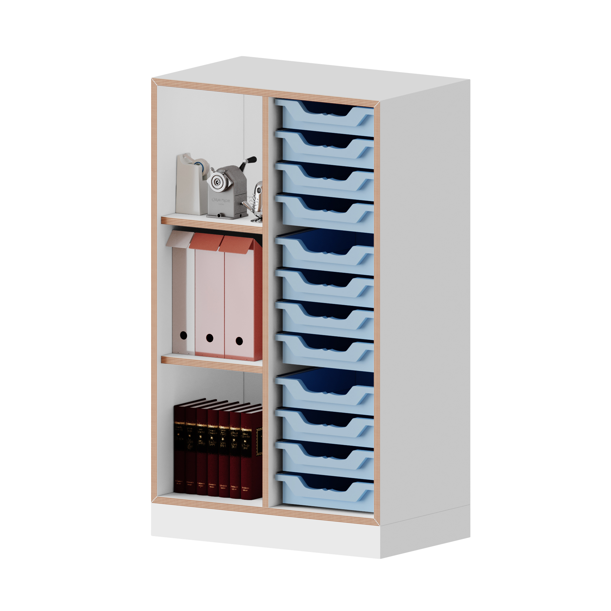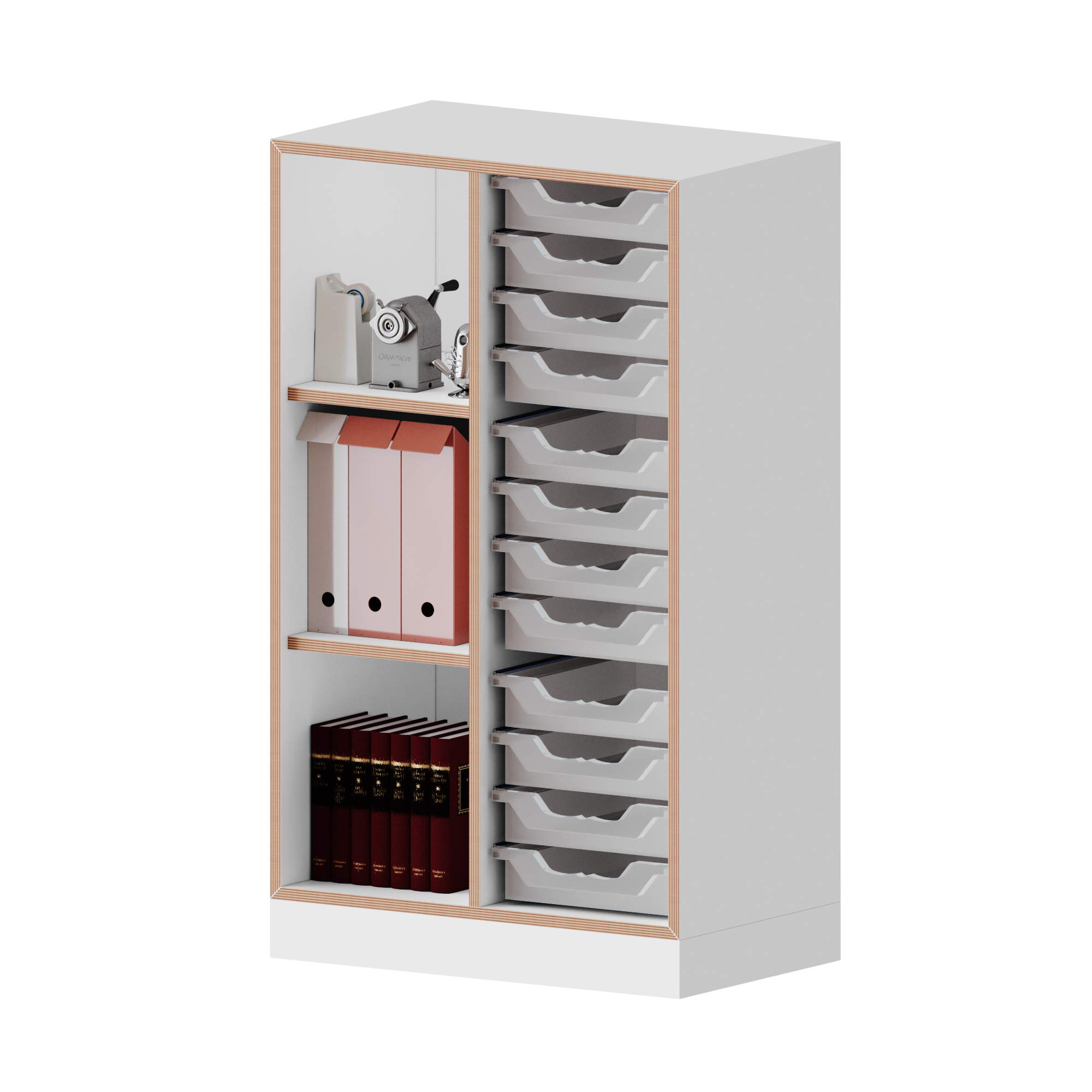 Ons qickly® rekkensysteem overtuigt door zijn 45 graden verstek en ABS-rand in multiplex-look. De lichaamskleur is witte melamine. Dit ultramoderne ontwerp maakt het klaslokaal en kantoor tot een echte eyecatcher. De plank overtuigt door veel opbergruimte en mobiliteit, waardoor hij zowel in scholen als op kantoren zijn plaats vindt. Het bevat 12 kleine Ergo Tray-dozen waarin al uw documenten kunnen worden georganiseerd. Daarnaast is het kastensysteem op ieder moment uit te breiden en desgewenst ook te bestellen met een set wielen waarvan er twee afsluitbaar zijn. De voethoogte bedraagt 8,6 cm. Bij gebruik van optioneel verkrijgbare zwenkwielen verandert de basishoogte niet. De materiaaldikte van de wanden en planken bedraagt 19 mm, de vaste achterwand is 8 mm dik en garandeert een hoge stabiliteit. De kast wordt gedemonteerd aan u geleverd inclusief montagehandleiding, zodat u deze zelf kunt monteren. Zoals de naam van ons assortiment al doet vermoeden, overtuigt het qickly® kast- en stellingsysteem door zijn snelle levering. Qickly® – Slim. Bijna. Eenvoudig.