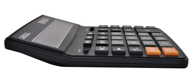 * Heavy Duty rekenmachine met dubbel geheugen, Mark-up functie en 12-cijferig display. * Extra groot formaat. * Werkt op zonne-energie en batterij. * Energiebesparende auto-off modus. * Rubberen voetjes. * Groot en schuin gepositioneerd duidelijk leesbaar LCD scherm. * LCD scherm voorzien van acryl glas. * Dubbel geheugen. * Grote makkelijk te bedienen toetsen. * Lay-out met voor de hand liggende kleur segmenten (functies/cijfers/on-ac) voor gemakkelijke input. * Afrondings- en decimaal-kiezer. * Zakelijke functies: MU - Backspace - 00. * Afmetingen 205x155x40mm.