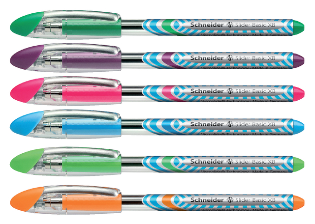 * Deze etui bevat 2 verschillende soorten pennen, de Schneider slider Basic XB en de Slider Rave beide in de kleur zwart. * De Slider Basic XB Balpen met innovatief ViscoGlide-Technologie voor soepelschrijvend schrift. * Een soepel intensief schrift, snelle droogtijd ook op glad papier, geen geknoei of strepen. * Gummi grip voor een aangename, vaste ergonomische grip. * Kleurherkenning aan dop en houder. * Schrijfkleur zwart is watervast, lichtecht en documentecht ISO 12757-2. * Kogelbreedte XB = 1,4 mm. * Inhoud Etui: 6 stuks. * De Slider Rave balpen; De populaire Viscoglide -technologie is nu beschikbaar in de intrekbare balpen Rave! * De nieuwe grote vulling Slider 755 met extra brede tip zorgt voor een gemakkelijk, glijdend schrijven en blinkt uit door hoge schrijfprestaties. * De inkt is watervast volgens ISO 12757-2. * De houder van de Slider Rave is van rubber en ergonomisch gevormd, dat maakt een natuurlijke schrijfbeweging mogelijk zonder vermoeidheid van de hand.