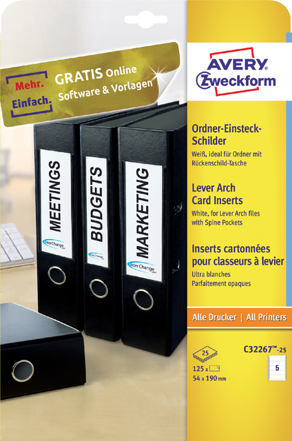 * Insteekkaart voor ordnerrug. * De insteekkaart is helemaal blanco, waardoor u ze volledig kan personaliseren. * Geschikt voor inkjetprinter, laserprinter en kopieerapparaat. * Gratis online templates en ontwerpsoftware beschikbaar op http://www.avery.eu.