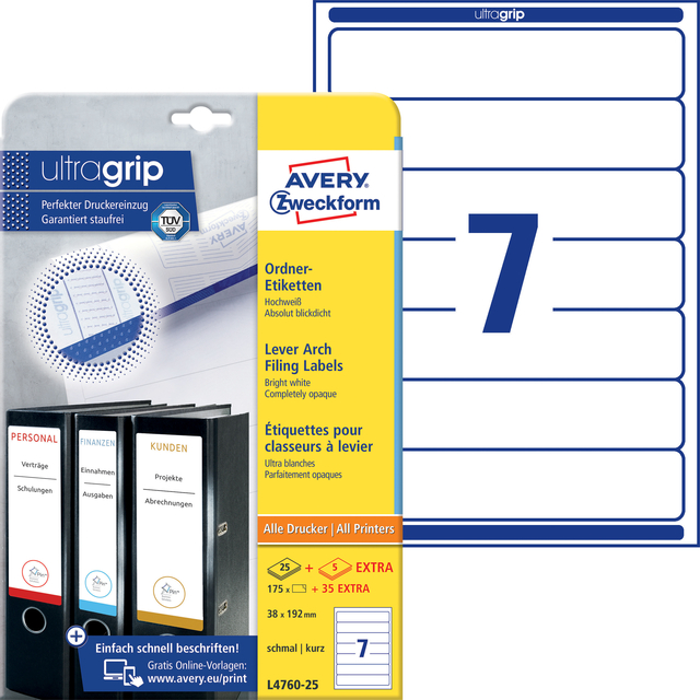 * Zelfklevende ordnerrugetiketten. * Eenvoudig bedrukbaar. * Op A4 vel, in diverse kleuren. * Avery ordneretiketten schijnen niet door (BlockOUT). * Alle witte etiketten zijn FSC-gecertificeerd. * Het etiket is blanco, waardoor u ze volledig kan personaliseren. * Geschikt voor inktjet, laserprinters en kopieerapparaten. * Gratis online templates en ontwerpsoftware beschikbaar op http://www.avery.eu.