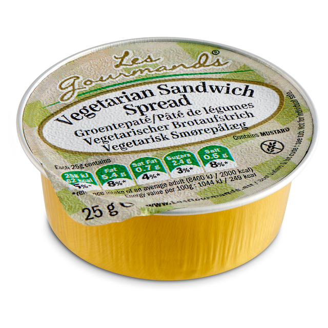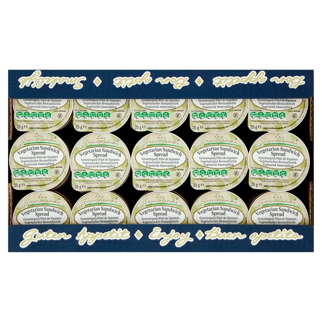 * Les Gourmands vegetarische sandwich spread is fris beleg gemaakt van groenten. De sandwich spread is lekker op brood of toast. Het product is houdbaar buiten de koeling. De spread is vegetarisch en glutenvrij. Verpakt in een doos van 45 cups à 25 gram.