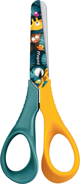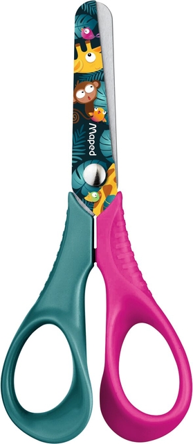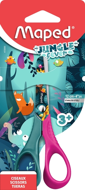 * De echte leerschaar voorzien van ergonomische 3D-ringen die perfect geschikt zijn voor kleine handen. * Ze garanderen een betere grip voor uw kind en gemakkelijker leren. De veiligheid wordt verder verhoogd door hun bladen met ronde punt. * Naast hun ergonomische ontwerp zijn deze scharen voorzien van roestvrijstalen bladen die na verloop van tijd niet bot worden, wat zorgt voor een snede van hoge kwaliteit. Deze schaar is bestand tegen jarenlange schoolgebruik. * Je mooiste tropische bladeren knip je met de Jungle fever schaar! Verkrijgbaar in twee kleuren, blauw/roze of blauw/geel, meisjes en jongens zullen verleid worden door de kleuren! * Deze roestvrijstalen schaar van 12 cm is perfect om uw kinderen te leren kleine vormen te knippen. Deze schaar is volledig aangepast aan kleine handen dankzij hun ergonomische 3D-handgrepen. Met zijn versierde bladen met ronde punten is er geen risico op letsel voor peuters!