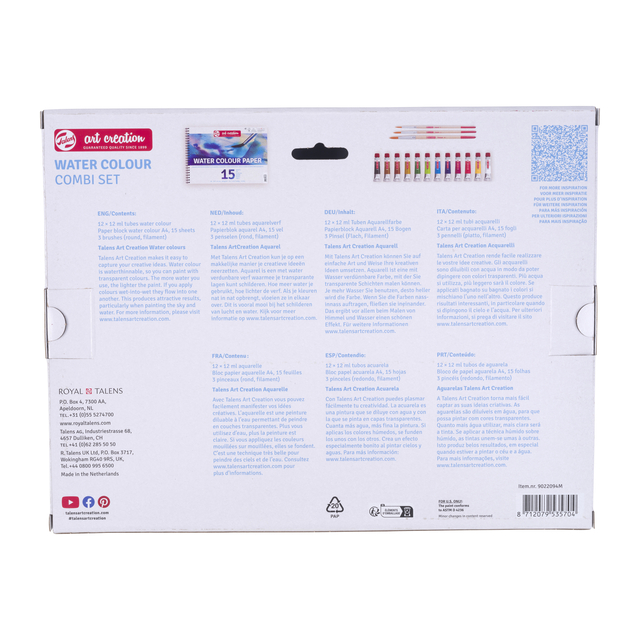 * De Talens Art Creation aquarel-combiset is de ideale keuze voor iedereen die aquarelverf wil ontdekken! * De set bevat 12 tubes van 12 ml in veelzijdige kleuren, waaronder geel, ultramarijn en gebrande sienna. Daarnaast bevat de set drie duurzame ronde polyester penselen (maten 4, 6 en 8), die uitstekend water vasthouden en perfect zijn voor een vloeiende toepassing in diverse technieken. De set wordt compleet gemaakt met een A4 aquarelblok met 15 vellen van 240 g/m² papier, dat een stevig, draagbaar oppervlak biedt met geperforeerde randen voor het eenvoudig verwijderen van je werk. * Ideaal voor creatieve uitbarstingen, zowel thuis als onderweg.