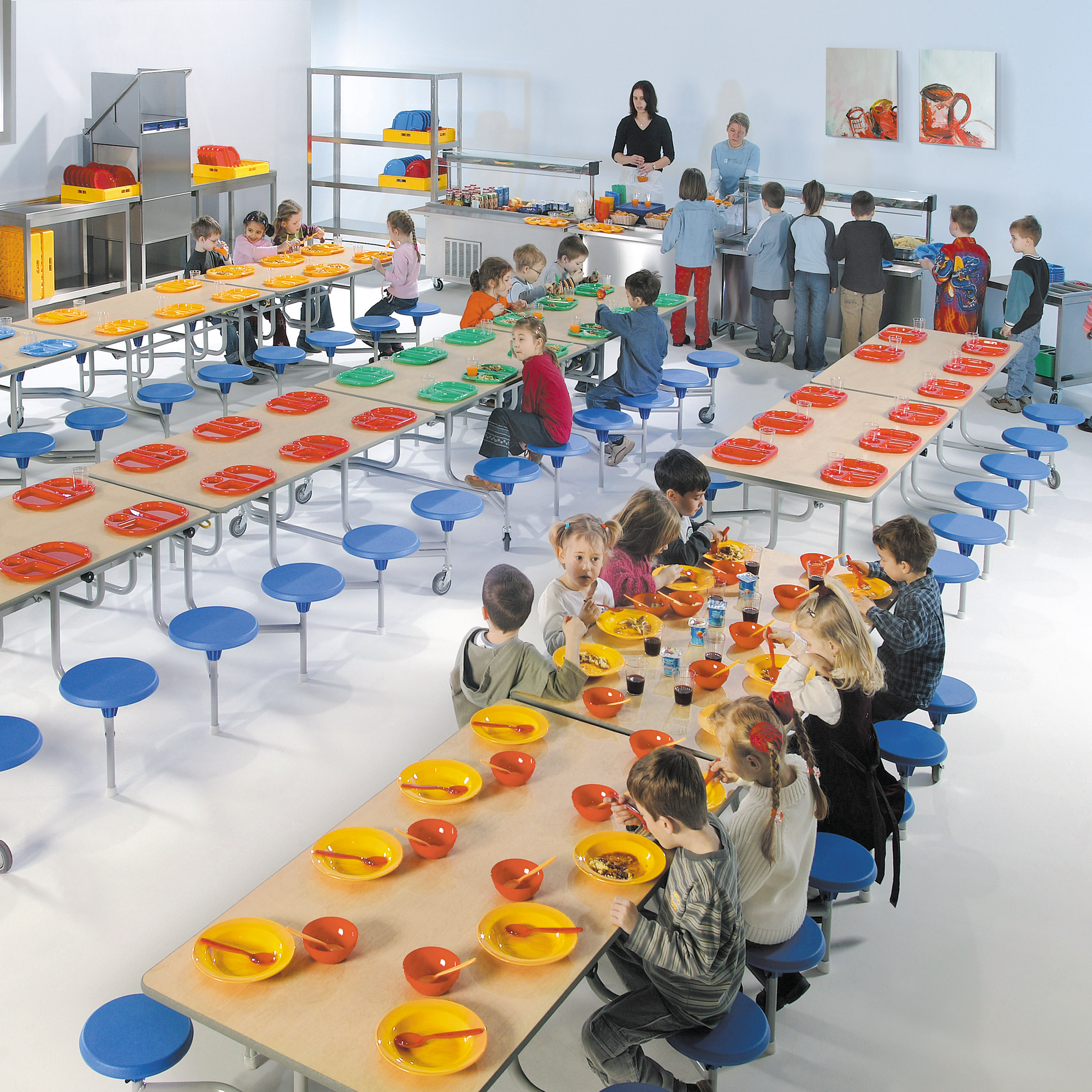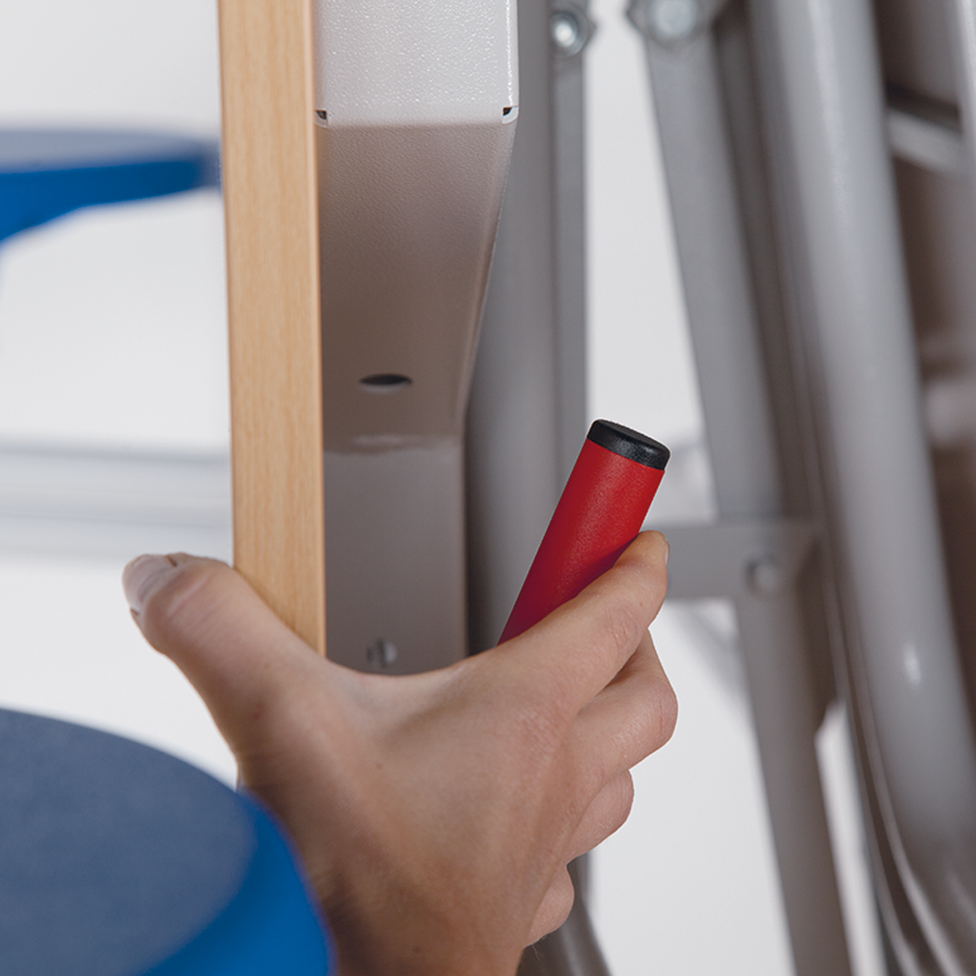 Een grote vrije ruimte - en slechts een paar minuten later een volledig zittende kantine! Ingeklapt zijn de verrijdbare tafels zeer mobiel en dankzij het praktische klapmechanisme zeer eenvoudig op te zetten. De transportvergrendeling maakt een veilige hantering mogelijk. Dit is bijzonder praktisch voor de hygiëne en het onderhoud van de kamer. Als de tafels eenmaal zijn samengevouwen, is het niet nodig om stoelen op de tafels te zetten of om de tafelpoten te vegen. Het 19 mm dikke laminaat-tafelblad met massief houten rand in beukendecor is bijzonder onderhoudsvriendelijk en kan natuurlijk met een vochtige doek worden afgeveegd. Het frame is altijd verkrijgbaar in RAL 7035, lichtgrijs.