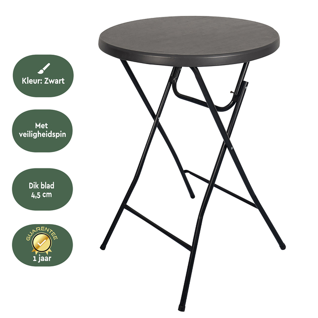 Met een tafelblad met een doorsnede van 80 cm creëer je direct extra ruimte voor je gasten. Na het openklappen kun je de tafel met een veiligheidspin vastzetten zodat de tafel gezekerd is en niet per ongeluk kan inklappen. * De tafel is makkelijk inklapbaar is tot een compact formaat en met zijn lichtgewicht berg je hem makkelijk op én is de tafel makkelijk te vervoeren. Deze praktische en gebruiksvriendelijke klaptafel kan zowel binnen als buiten gebruikt worden gebruikt. De poten zijn voorzien van rubberen beschermdoppen, waardoor de kans op krassen wordt verminderd. * Het tafelblad is gemaakt van hoogwaardig kunststof met een mooie ronde vorm, waar tot 8 personen comfortabel aan kunnen plaatsnemen. Het frame is gemaakt van poedercoated metaal en kan eenvoudig worden opgevouwen. Het feest kan direct beginnen want de tafel wordt volledig gemonteerd geleverd. * Het schoonmaken van de BRASQ Statafel is een fluitje van een cent, het oppervlak kan met een natte schoonmaakdoek en wat schoonmaakmiddel gemakkelijke afgenomen worden. Met de optionele bijpassende hoes voeg je zowel stijl als bescherming toe aan je tafel. Deze statafel is een veelzijdige en handige optie voor elk evenement of gelegenheid. * Afmeting product ⌀80x110cm * Draagkracht/belastbaarheid 50 kg * Matalen frame * Dikte tafelblad 4,5cm * Geschikt voor binnen- als en buitengebruik * GS-TUV certificering * 1 jaar garantie * CEcertificering