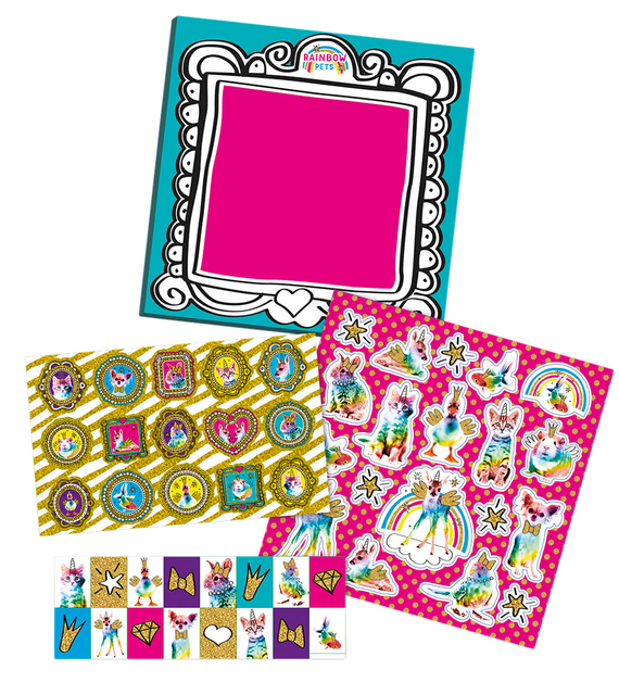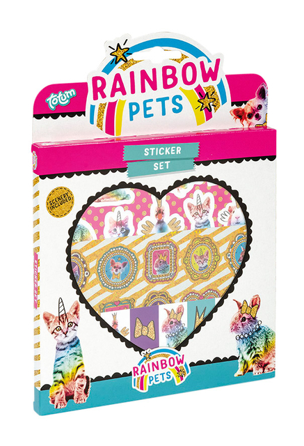 * Rainbow Pets stickerset. * Set met 3 vellen stickers en kartonnen speelachtergrond.