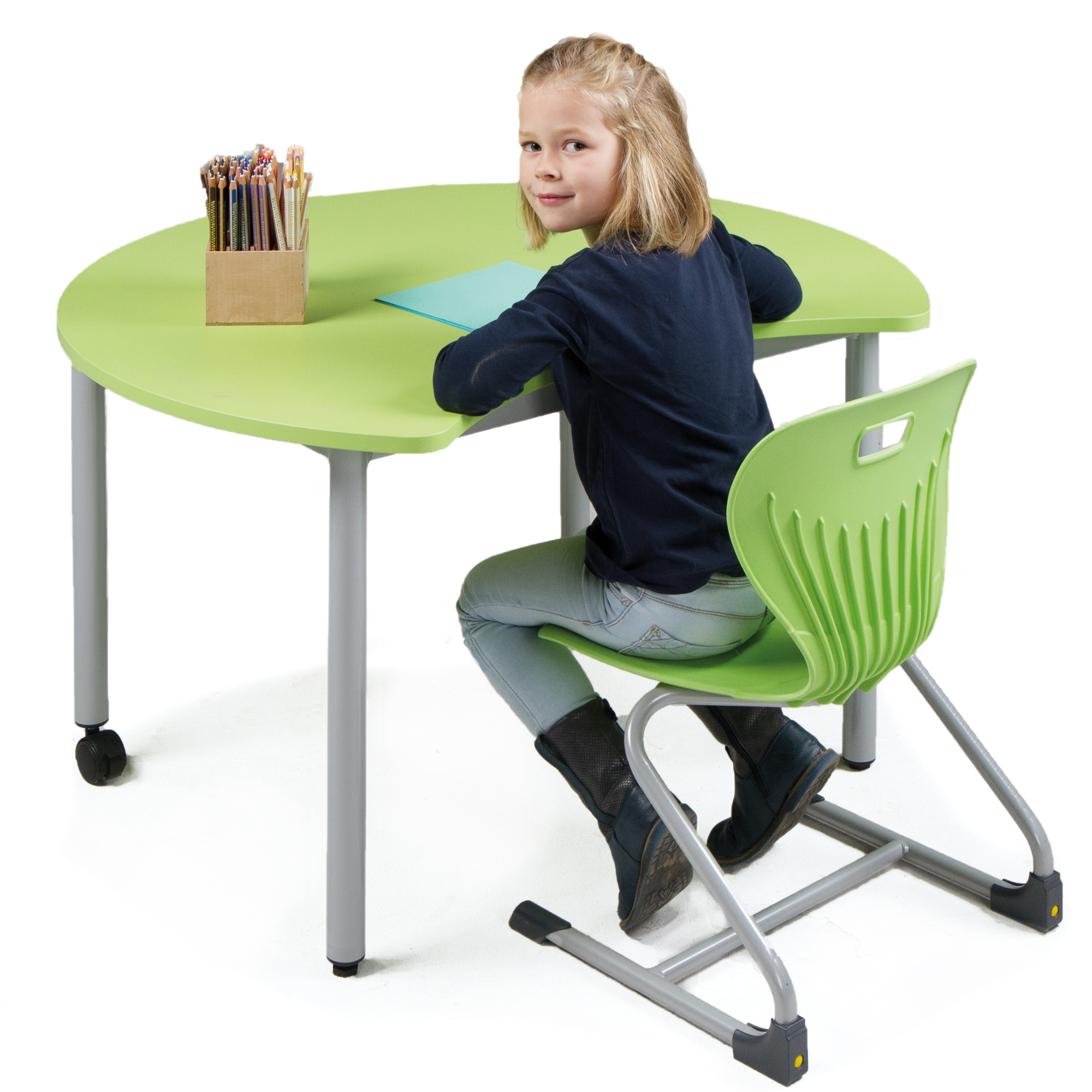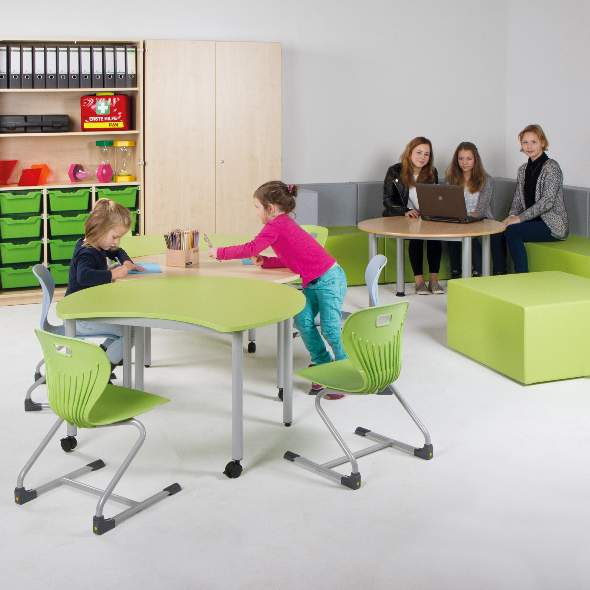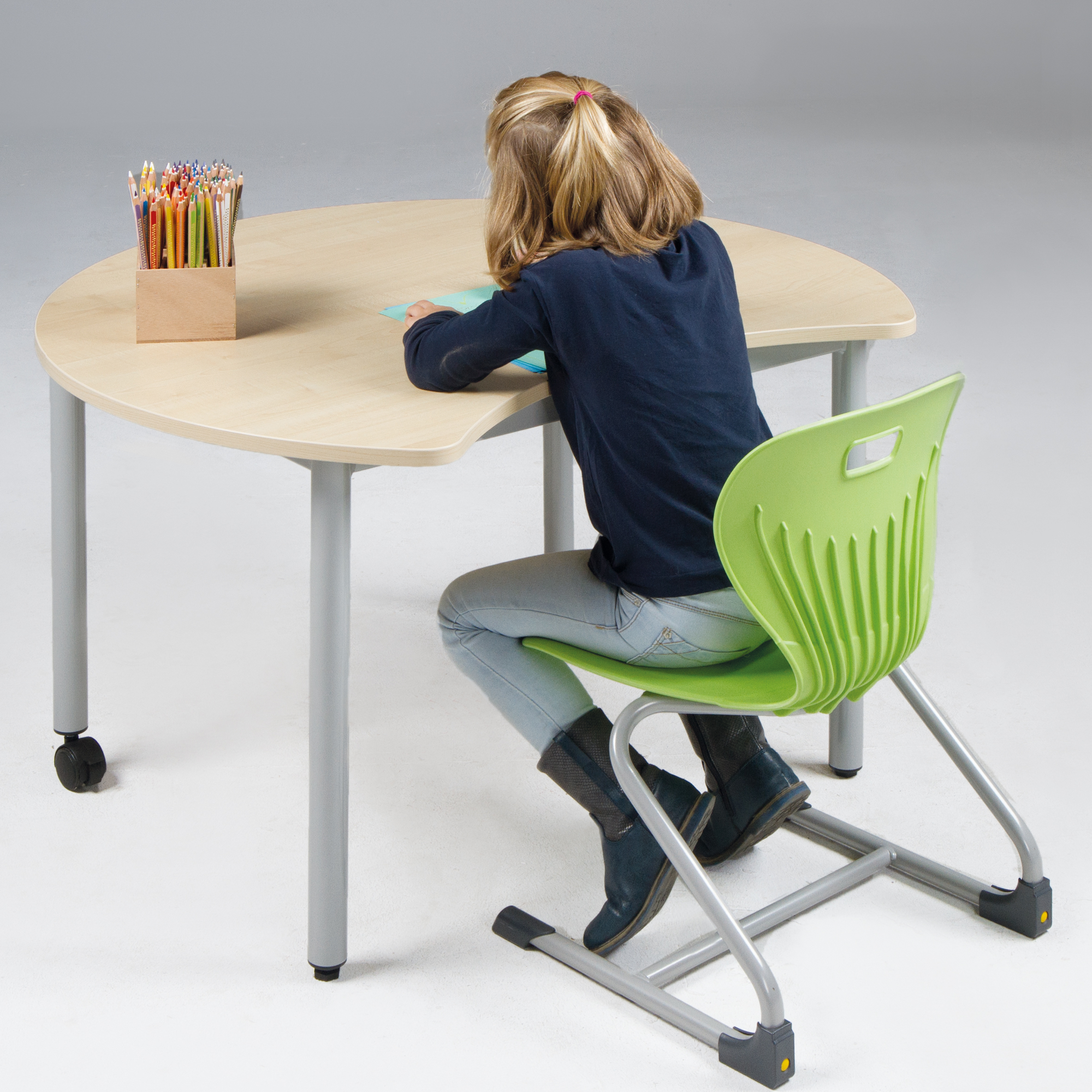 Bij de uitsparing kunnen meerdere tafels naast elkaar worden geplaatst – laat uw fantasie de vrije loop en creëer steeds weer spontaan nieuwe ruimtelijke situaties. De tafels van de serie "PAC" zijn gebaseerd op een rond blad met een diameter van 100 cm en zijn voorzien van een corpusuitsparing. Op deze manier kunnen de kinderen heel dicht bij de tafel komen en er goed aan werken. Er kunnen snel meer kinderen mee voor spontaan groepswerk. Het 4-poots tafelonderstel is stevig gelast en gepoedercoat. Twee van de vier poten hebben wieltjes zodat je de tafels snel kunt herschikken. Beide zwenkwielen zijn vergrendelbaar. Het tafelblad met ABS-randen is gemaakt van 19 mm dikke, gemelamineerde spaanplaat in milieuvriendelijke E1-kwaliteit. Het is bijzonder gemakkelijk schoon te maken en kan natuurlijk met een vochtige doek worden schoongeveegd.