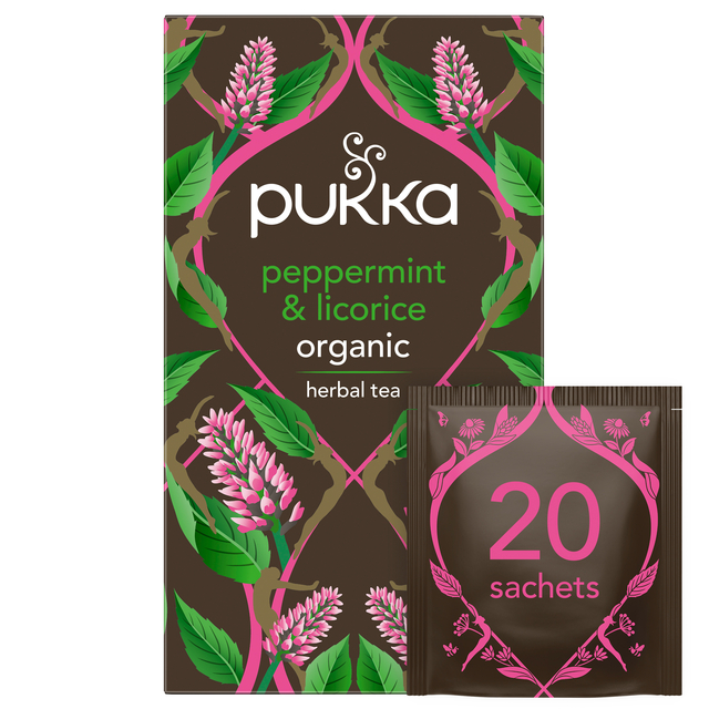 * Pukka Peppermint & Licorice is een magische blend met pepermunt en zoethout, een klassieke combinatie. Gemaakt van 100% biologische ingrediënten die duurzaam verbouwd zijn. * Breng deze heerlijke kruiden tot leven door ze tot 15 minuten in vers gekookt water te laten trekken. * Een doosje bevat 20 individueel verpakte theezakjes die volledig biologisch afbreekbaar zijn.