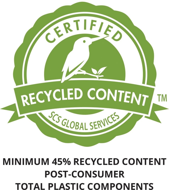 * Gecertificeerd gerecycled materiaal dat voldoet aan de SCS Recycled Content Standard V8-0 voor minimaal 45% post-consumer recycled content van de totale plastic onderdelen. Met uitzondering van de printplaat, oplaadbare batterij, 2,4 GHz dongle en oplaadkabel.
