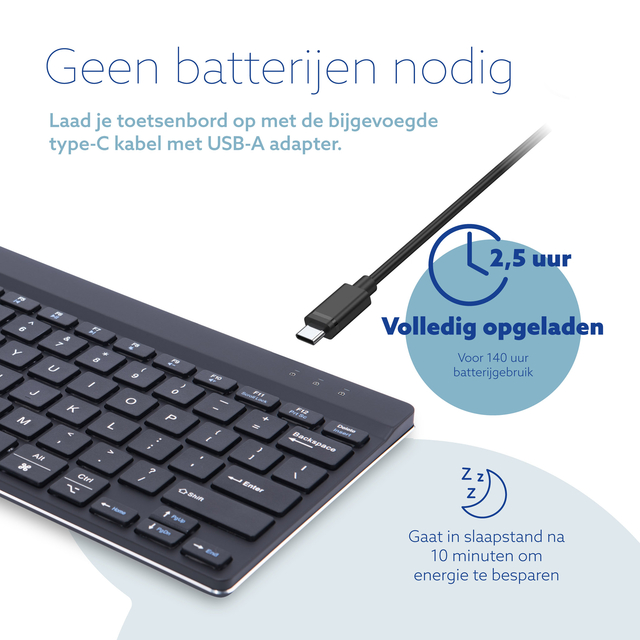 * Dit compacte toetsenbord beschikt over alle ergonomische kenmerken om gezond te kunnen typen. Het compacte design zorgt ervoor dat je handen bij gelijktijdig gebruik van toetsenbord en muis altijd binnen schouderbreedte blijven. De lichte toetsaanslag vermindert de spierspanning tijdens het typen. Het toetsenbord is ultra dun, zodat je handen en polsen tijdens het typen in een ontspannen, natuurlijke stand staan. Dit zorgt voor een betere doorbloeding van je handen. * Het R-Go Compact Break toetsenbord geeft met LED- kleursignalen aan wanneer het tijd is om te pauzeren. Tijdens het typen verandert het lampje van kleur, zoals bij een stoplicht. Als het lampje groen oplicht, betekent het dat je gezond werkt. Oranje geeft aan dat het tijd is voor een korte pauze en rood dat je te lang hebt doorgewerkt. * Met het inlassen van korte pauzes tijdens je werkdag zal je concentratie verhogen, voorkom je overbelastingklachten en blijf je fit tijdens je werkdag. * Specificaties; * Aansluiting via bluetooth. * Type verbinding Bluetooth 5.0. * Compabiliteit, Windows, Mac OS, Linux. * Geen USB ontvanger. * Draadloos bereik 10mtr. * Afmeting 9x285x139mm (HxLxB).