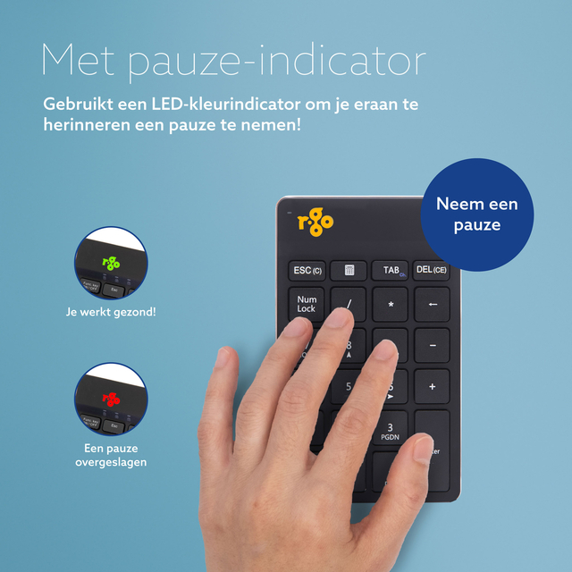 * Ervaar maximale vrijheid tijdens het typen met het R-Go Numpad Break. * Je kunt dit numerieke toetsenbord bedienen met je linker- of rechterhand en zelf bepalen waar je het neerlegt op je bureaublad. * Door het numeriek te bedienen met de hand die niet muist, blijven beide handen tijdens het werk binnen schouderbreedte en verdeel je de belasting over beide handen. * Ideaal in combinatie met het R-Go Compact Break en R-Go Split Break toetsenbord. * Het ultradunne ontwerp zorgt ervoor dat je pols tijdens het typen in een natuurlijke, platte stand staat. * Het speciale schaarmechanisme in de toetsen zorgt voor een lichte toetsaanslag, waardoor je minder kracht nodig hebt om te typen. * Het R-Go Numpad bevat een ingebouwde pauze indicator, die met kleursignalen (groen, oranje, rood) aangeeft wanneer het tijd is om je werk te onderbreken. * Ergonomisch ontwerp: Het ultradunne ontwerp van dit numerieke toetsenbord zorgt ervoor dat je pols tijdens het typen een natuurlijke platte houding heeft. Zo kun je typen zonder dat de bloedvaten en pezen worden afgekneld. * Met pauzesoftware:Voorkom klachten door regelmatig te pauzeren. Dit numpad heeft gepatenteerde pauzesoftware en geeft met kleursignalen aan wanneer het tijd is om te pauzeren. De R-Go Break software heeft in 2021 de Benelux Office Award gewonnen. * Lichte toetsaanslag:Het speciale schaarmechanisme in de toetsen zorgt voor een lichte toetsaanslag, zodat je minder spierkracht nodig hebt om te typen. * Gemaakt met het oog voor het milieu:De toetsenborden van R-Go Tools zijn gemaakt van gerecycled kunststof. * Compatibel:Dit numpad is bedraad en draadloos verkrijgbaar. Het bedrade numpad is eenvoudig aan te sluiten met de USB-kabel van 1,5 m. De draadloze variant werkt met Bluetooth verbinding. Kan apart of met R-Go Break toetsenborden gebruikt worden.