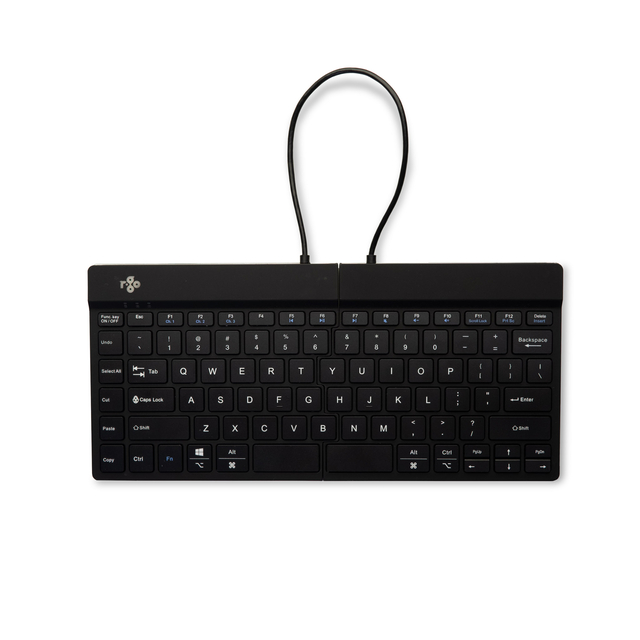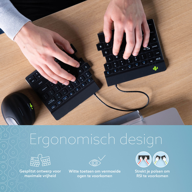 * Het R-Go Split Break toetsenbord is een ergonomisch gesplitst toetsenbord met geïntegreerde pauzesoftware. Dit toetsenbord stimuleert je om regelmatig pauzes te nemen. Zo blijft de doorbloeding van je lichaam op peil, voorkom je overbelasting en blijf je fit tijdens je werkdag. * Het toetsenbord bestaat uit twee losse delen, die je in elke gewenste opstelling kunt plaatsen. Dit splitsen voorkomt een knik in de polsen tijdens het typen. * Typen met rechte polsen verlaagt de spierspanning en voorkomt afknelling van pezen en bloedvaten. * Door de ingebouwde magneet kun je de twee afzonderlijke delen van het toetsenbord met 1 beweging veranderen in een compact toetsenbord. * Het compacte formaat zorgt ervoor dat de muis altijd binnen handbereik ligt. * Door de lichte toetsaanslag is er minimale spierspanning aanwezig tijdens het typen. * Het toetsenbord is plat, waardoor je handen en polsen tijdens het typen plat en ontspannen zijn. * De LED- kleursignalen in het toetsenbord geven aan hoe gezond je werkt en wanneer het tijd is voor een pauze. * Tijdens het typen verandert het lampje van kleur, zoals bij een stoplicht. Groen betekent ‘goed bezig’, oranje dat het tijd is voor een pauze, rood dat je te lang hebt doorgewerkt. * Door deze subtiele kleursignalen ontvang je op een eenvoudige en positieve wijze feedback over je pauzegedrag. * 2 delen voor maximale vrijheid. * Met pauze indicator. * Ultra dun voor betere bloedcirculatie. * Lichte toetsaanslag voor minimale spierspanning. * Makkelijk mee te nemen.