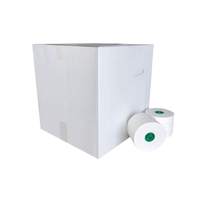 * Het toiletpapier met dop zorgt voor een optimale efficiëntie in uw dispenser. * Twee rollen naast elkaar zorgen ervoor dat uw gasten nooit zonder papier komen te zitten. * Een ideale oplossing voor locaties met een hoog aantal bezoekers per dag. * Capaciteit 100 meter per rol, gelijk aan 3 traditionele toiletrollen van 400vel. * Cellulose tissue papier. * Goed absorptievermogen. * Oplosbaar in koud water. * Rollengte 100m. * Rolbreedte 9,8cm. * Diameter 13cm. * 2-laags papier. * Aantal vellen 800. * Pak van 36 rollen. Door de speciale dop is deze veelal universeel inzetbaar in bestaande dispensers van verschillende merken.