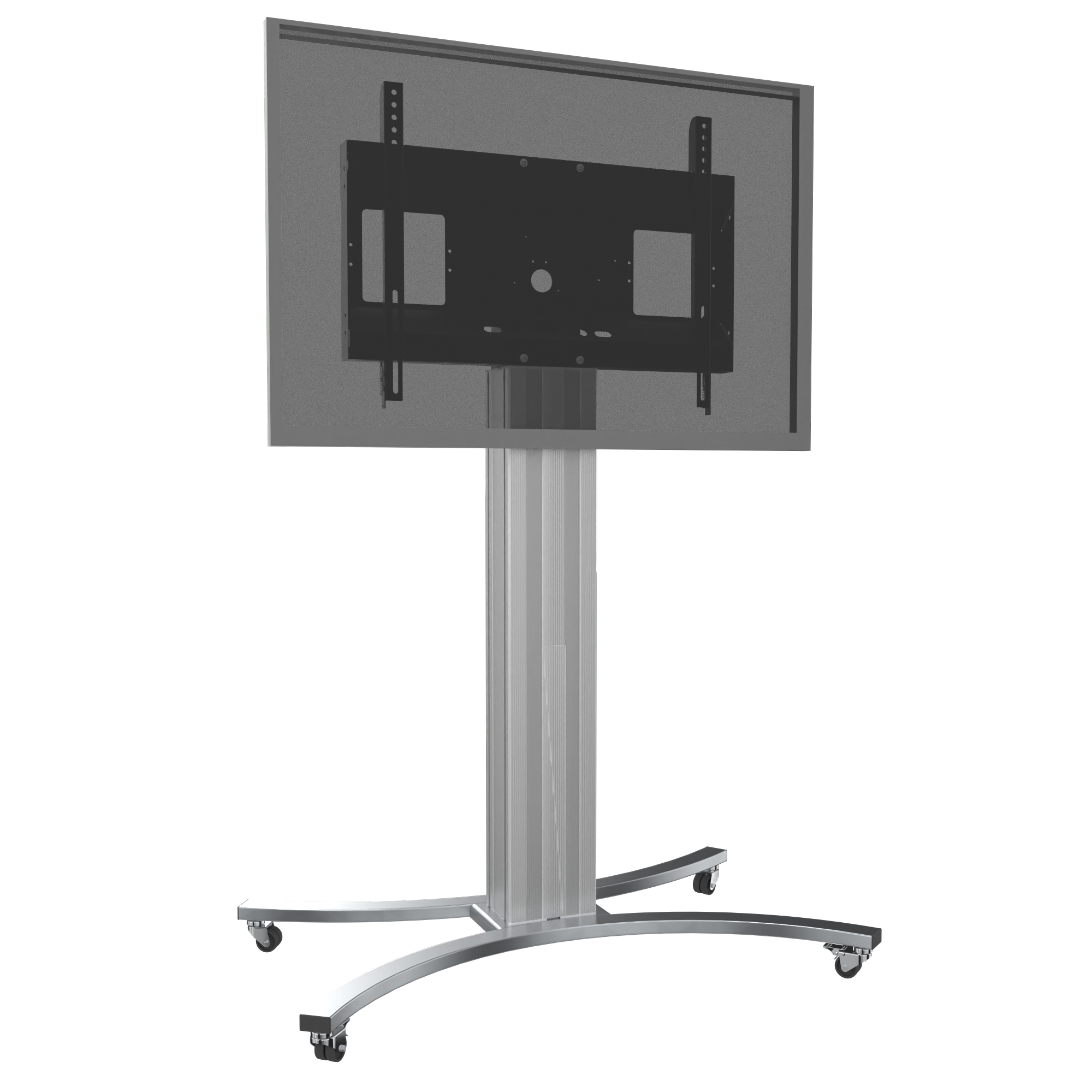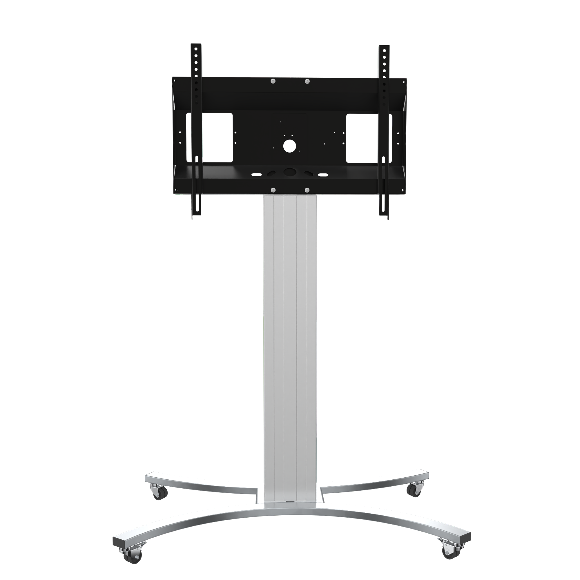 Tv-trolley voor touchscreen monitoren met een diagonaal van 42"-100". Voor toepassingen waarbij niet per se een hoogteverstelling nodig is, biedt Conen Mounts een reeks niet in hoogte verstelbare tv-trolleys. De rolstaanders zijn voorzien van een centrale aluminium kolom van verschillende hoogtes. De beeldschermbevestiging wordt boven de middenkolom gemonteerd. Dit biedt de mogelijkheid om de kabels achter het display op te bergen. De mobiele monitorbeugel is voorzien van het C-vormige rolframe. Het C-frame wordt geleverd met vier met rubber beklede lichtlopende zwenkwielen, waarvan twee met parkeerrem. Het systeem wordt gedemonteerd geleverd in drie verpakkingseenheden. Verzenden kan per pakketdienst.