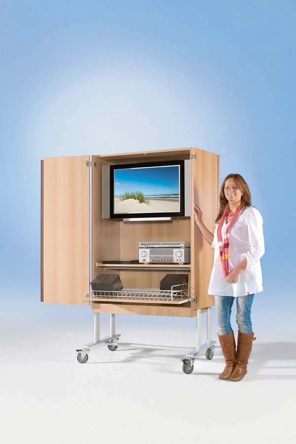 Een stevige & stabiele TV-kast voor LCD-, Plasma- of LED-TV's.Alleen met dit type TV kasten kan men dure flatscreens veilig verplaatsen. Indien je een gewone kast zou gebruiken, kunnen de flatscreens behoorlijk beschadigd worden.Links en rechts van het stalen frame bevinden zich handgrepen waarmee men de kast probleemloos kan manipuleren.Specificaties:270° openslaande deuren4 belastbare zwenkwielen waarvan 2 geremdstevig & stabiel stalen frameincl. veiligheidsslotincl. ophangbeugel voor flatscreen TV'singebouwde beveiliging tegen het te ver uittrekken van het schermuitgerust met een ventilatieroostertje tegen oververhittingU kunt onze TV kasten uitrusten met een uittrekbaar legbord voor het TV toestel of een uittrekbaar opbergvak waar video tapes, CD's of DVD's in opgeborgen kunnen worden.Afmetingen:Breedte: 108 cmHoogte: 189 cmDiepte: 60 cm