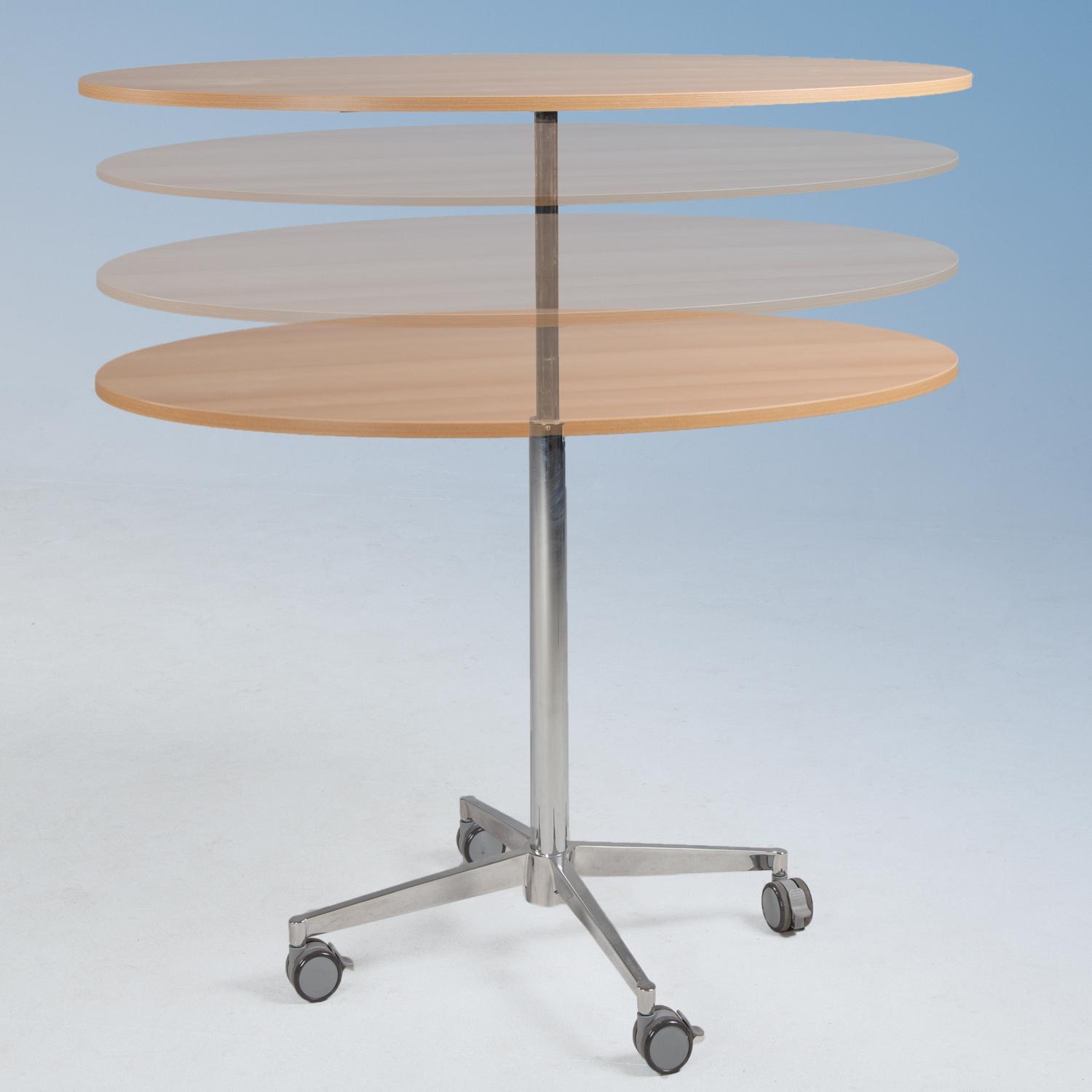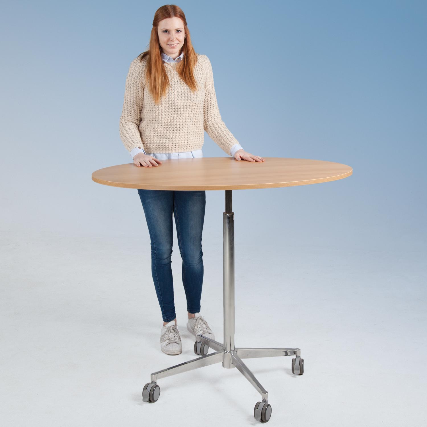 Werk zittend of staand! Deze in hoogte verstelbare tafel heeft een centraal kolomonderstel met een viersteronderstel van gepolijst aluminium. De hoogteverstelling werkt met een gasdruksysteem. U draait de plaat en maakt de vergrendeling los - nu kan de tafel worden versteld. Als de juiste hoogte is ingesteld, draai je de plaat gewoon weer een klein stukje en het systeem klikt vast. De tafel is gemakkelijk te verplaatsen dankzij de vier zwenkwielen, waarvan er twee vergrendelbaar zijn. De 12 mm dikke, hoogwaardige Powersurf-massieve plaat of als alternatief onze hoogwaardige melamineplaat heeft een hoge slijtvastheid en krasbestendigheid. Deze eenvoudig in hoogte verstelbare tafel is verkrijgbaar in veel verschillende vormen en kleuren.