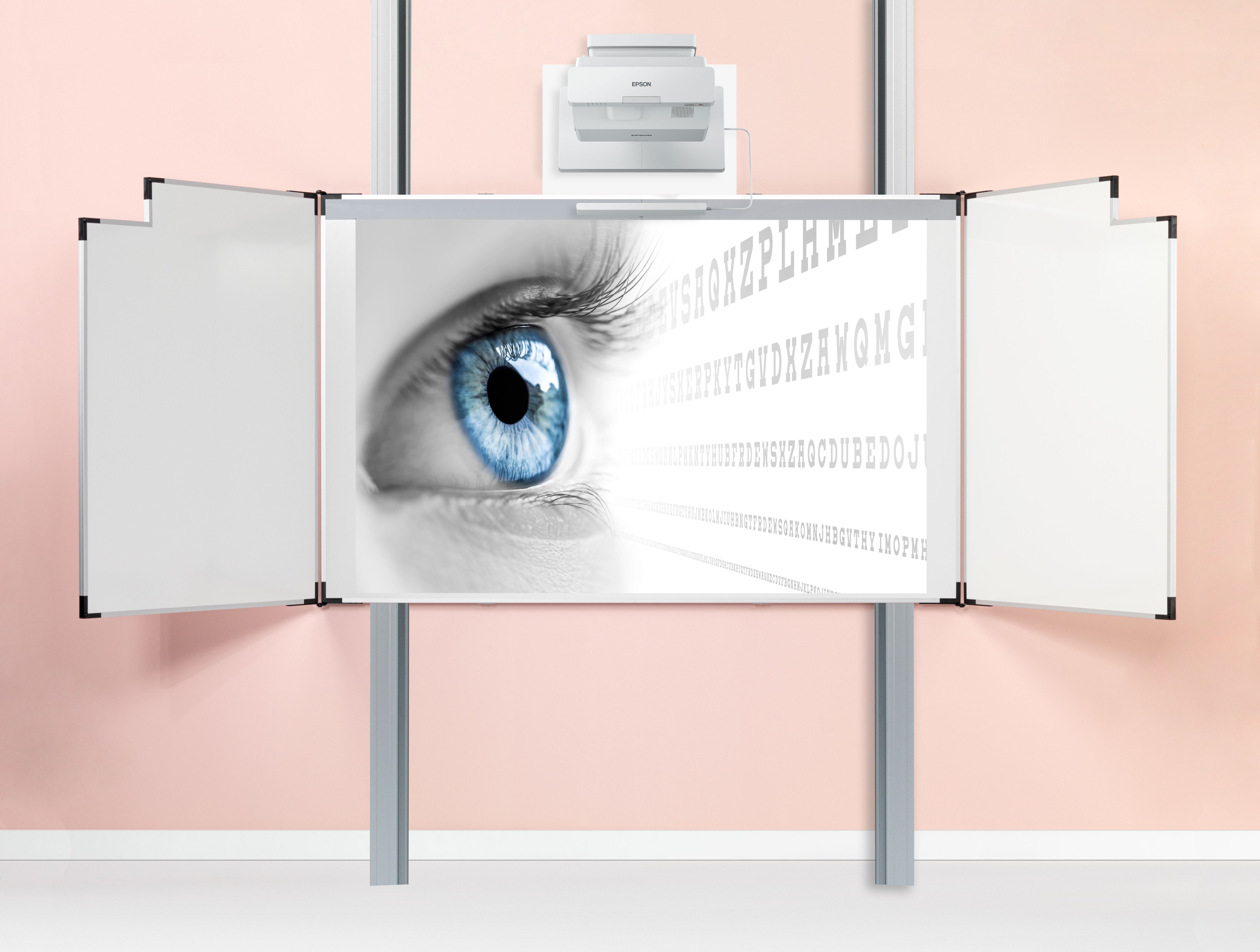 Projectiebord voor interactieve finger-touch projectoren (16:9), zoals bijv. Epson EB-1485Fi. Zeer dunne en lichte constructie met vlak opliggend aluminium profiel. Middenvlak: Low Gloss emailstaal met grijze strook voor plaatsing touch sensor. Vleugels: wit emailstaal. Inclusief 2 aluminium afleggoten van 31 cm. Kolomborden traploos in hoogte verstelbaar, zeer stabiele constructie. Magneethoudend en droog uitwisbaar.
