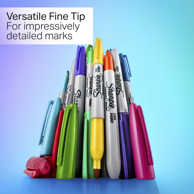 * Creatief en permanent. * Sharpie permanent markers inspireren om alledaagse oppervlakten te transformeren in passionele creatieve expressive. * Met een uniek en levendig kleurenassortiment is schrijven op bijna alle oppervlakken nooit nog saai. * De originele sharpie inkt droogt snel, is waterbestendig en de kleur vervaagt niet. * Gebruik de ultrafijne penpunt voor proper en precies werk.