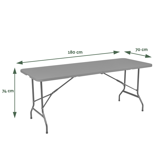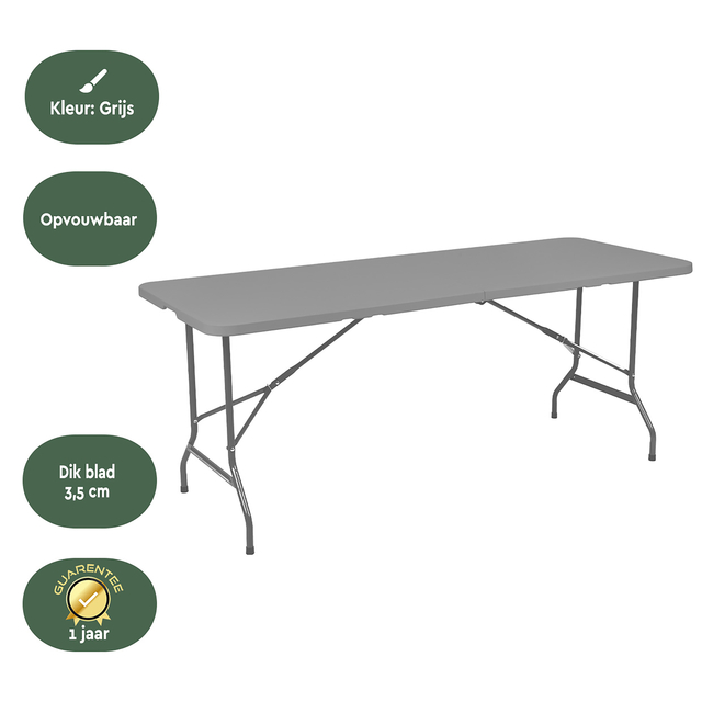 Al met al biedt de praktische BRASQ vouwtafel extra ruimte in een handomdraai, voor elke gelegenheid. * Specificaties: Afmetingen: 180x70x74 (lxbxh) * Gewicht: 11,5 kg * Kleur: Grijs * Dikte blad: 3,5 cm * Materiaal blad: HDPE plastic * Materiaal frame: stalen buizen * Draagkracht: 100 kg * Gebruikersadvies: geschikt voor zowel binnen als buiten * Montage: gebruiksklaar geleverd * Handleiding: Ja * Certificering: CE * Garantie: 1 jaar