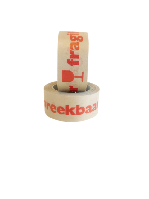 * Mileuvriendelijke oplossing voor waarschuwingstape. 80% gerecycled. * Bruin. * 50 mm x 50 meter. * Bedrukt in rood met de tekst Breekbaar Fragile en glas