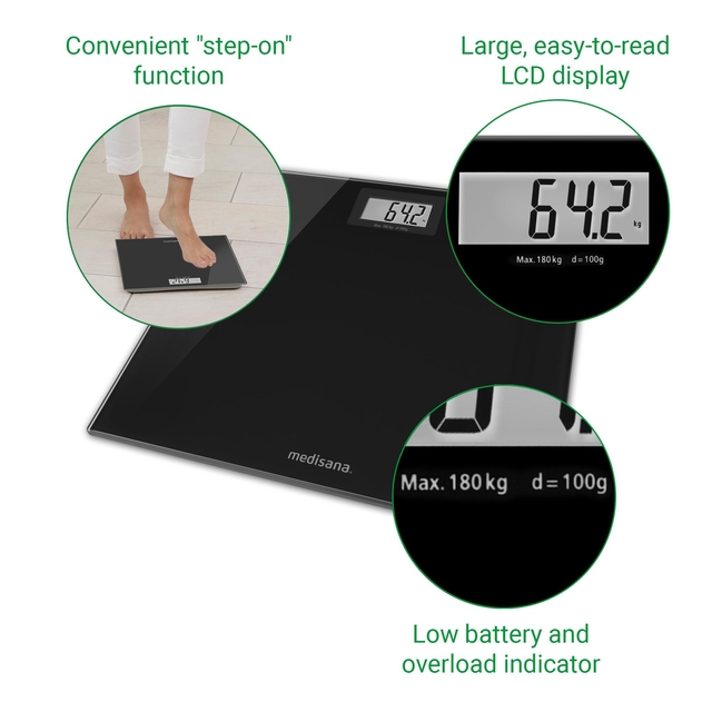 * De glazen personenweegschaal PS 400 van medisana, een van de toonaangevende specialisten op de thuiszorgmarkt, is een betrouwbare partner voor dagelijkse gewichtscontrole. Dankzij het bijzonder platte design is de medisana PS 400 glazen weegschaal een moderne blikvanger voor elke badkamer.