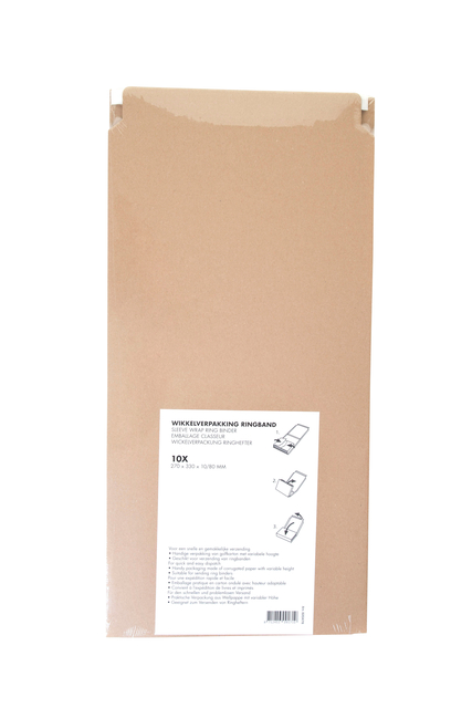 * Stevige kwaliteit wikkelverpakking voor het veilig verzenden van oa ringbanden, ordners en boeken. * Gemaakt van stevig karton met enkele golf. * De wikkelverpakking is voorzien van een zelfklevende sluiting. * En de vulhoogte is 10-90mm hoog, buitenmaat gevouwen; 385x290x10- 90mm, binnenmaat 335x270x 10-90 mm.